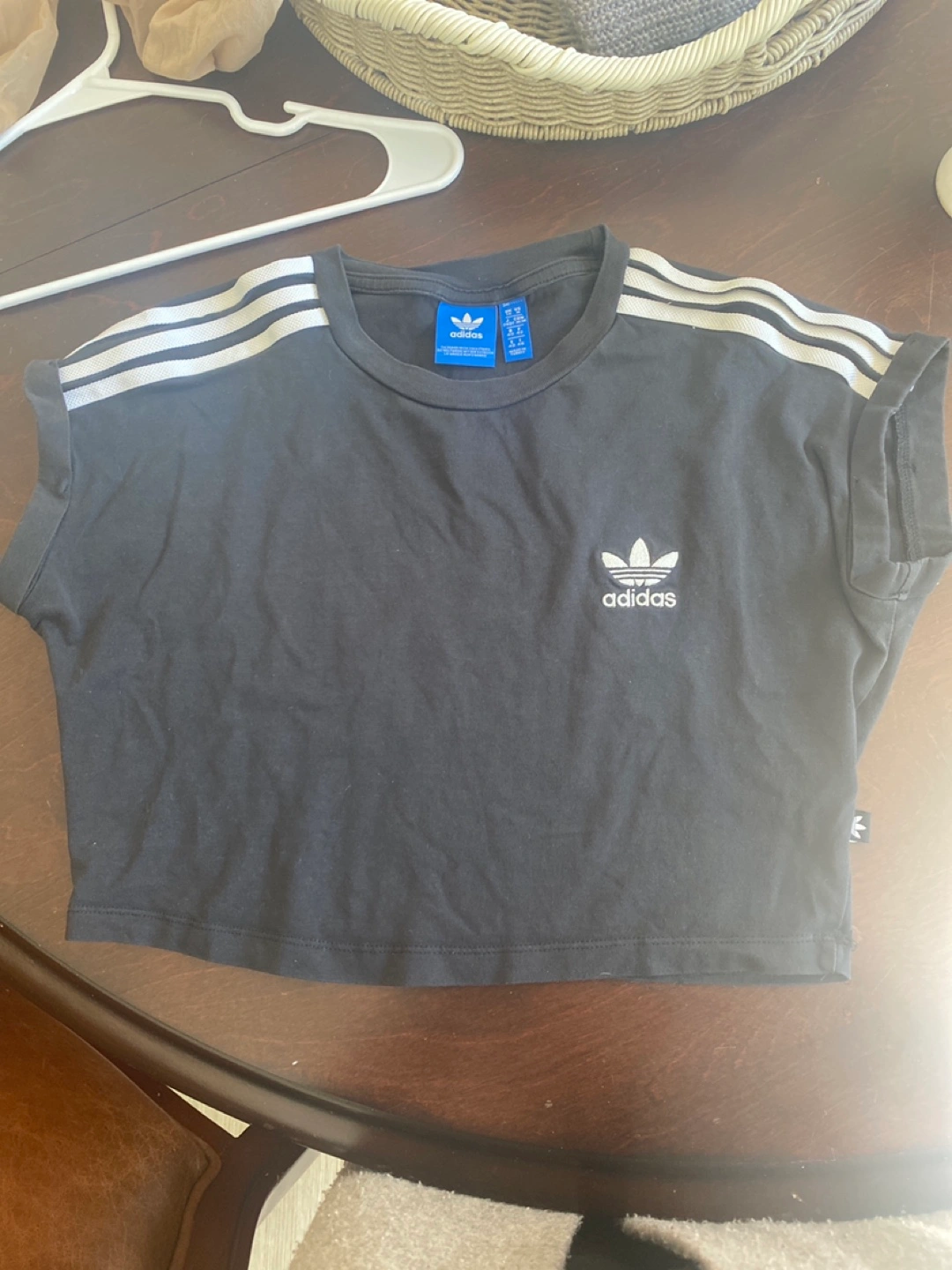 Black cropped Adidas t-shirt. Features three white stripes on the sleeves and a small Adidas logo on the chest. Short sleeves. Good condition.pick up in Newmarket near 404 Mulock & Leslie Smoke free / pet free