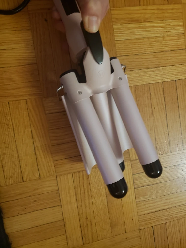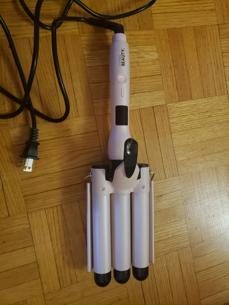 Rose gold triple barrel curling iron. Features digital temperature control. Includes power cord. Gently used. Foldable for traveling.