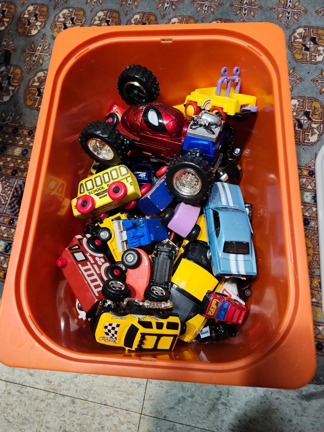 Collection of various toy cars, trucks, and buses, even a zamboni. Includes Spider-Man monster truck. Suitable for 3+. Some have small wheels.