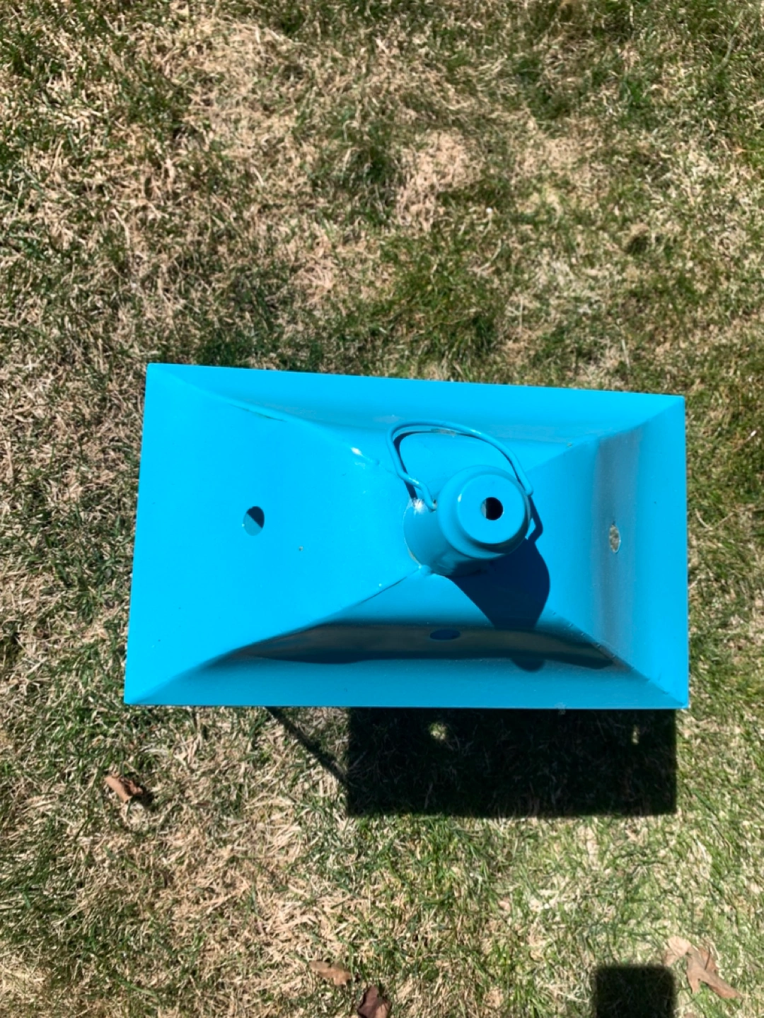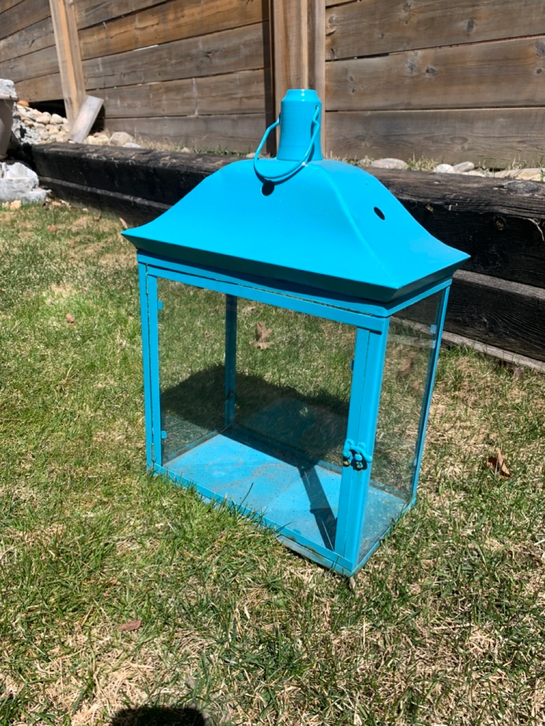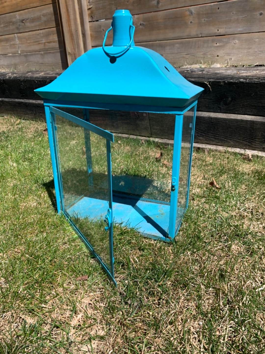 Porch pick up. Pretty teal coloured metal lantern. Glass panels. With operational door with a latch. Perfect for candles or decor. Outdoor use.