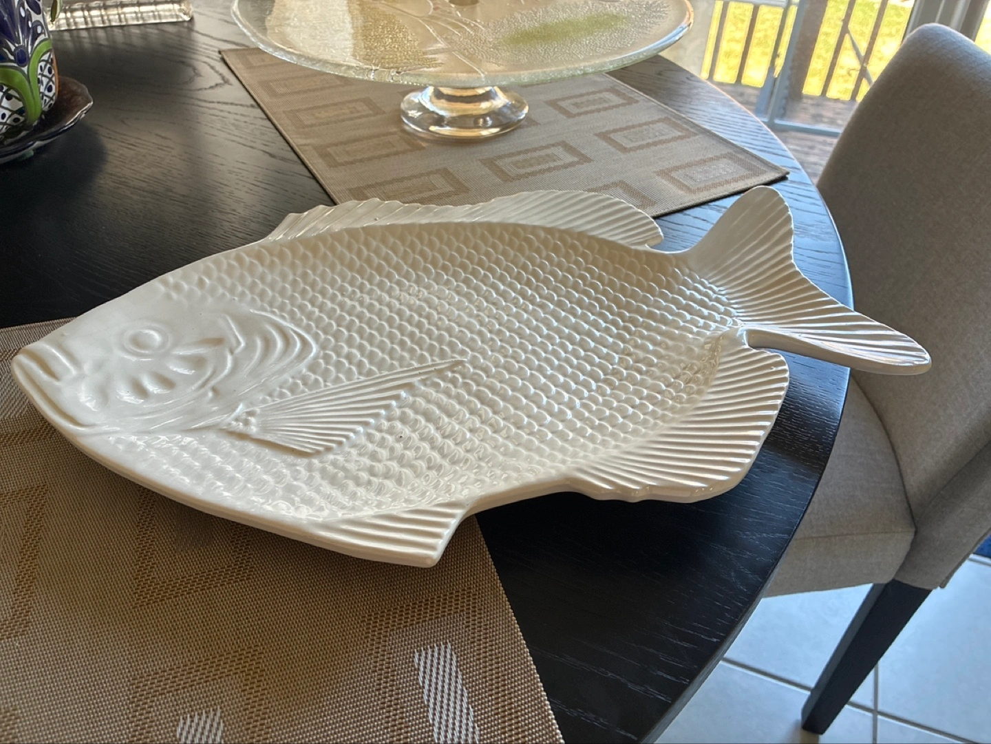 Unique ceramic serving platter. Fish design. White colour. Great for entertaining. Shows minor wear.