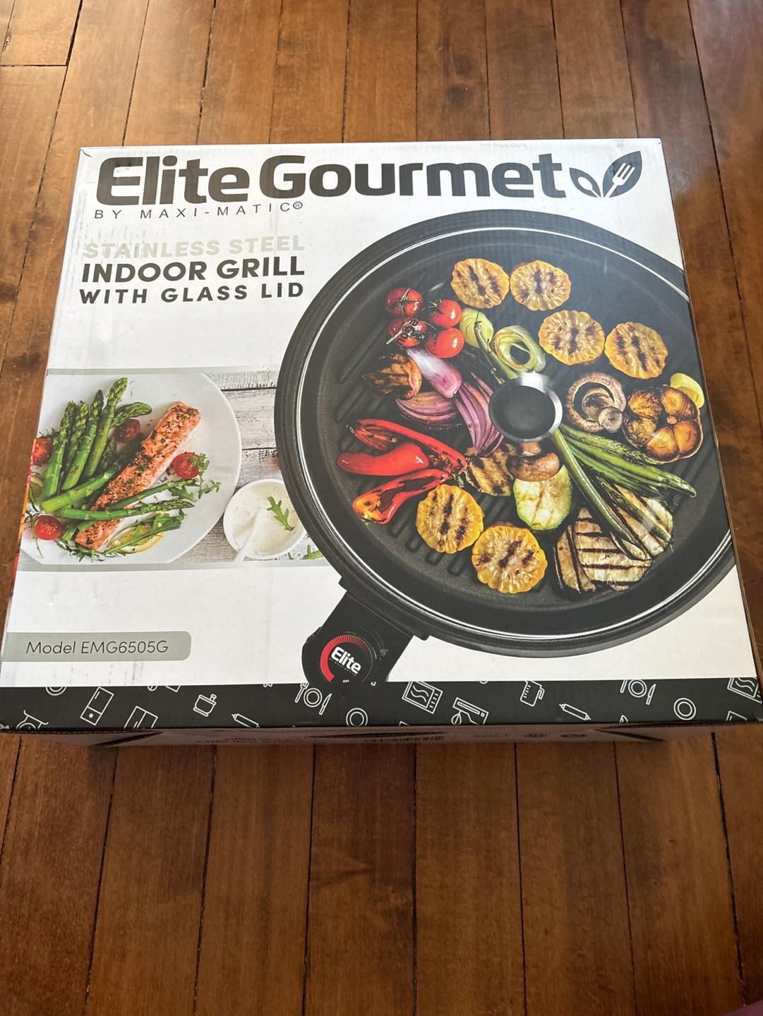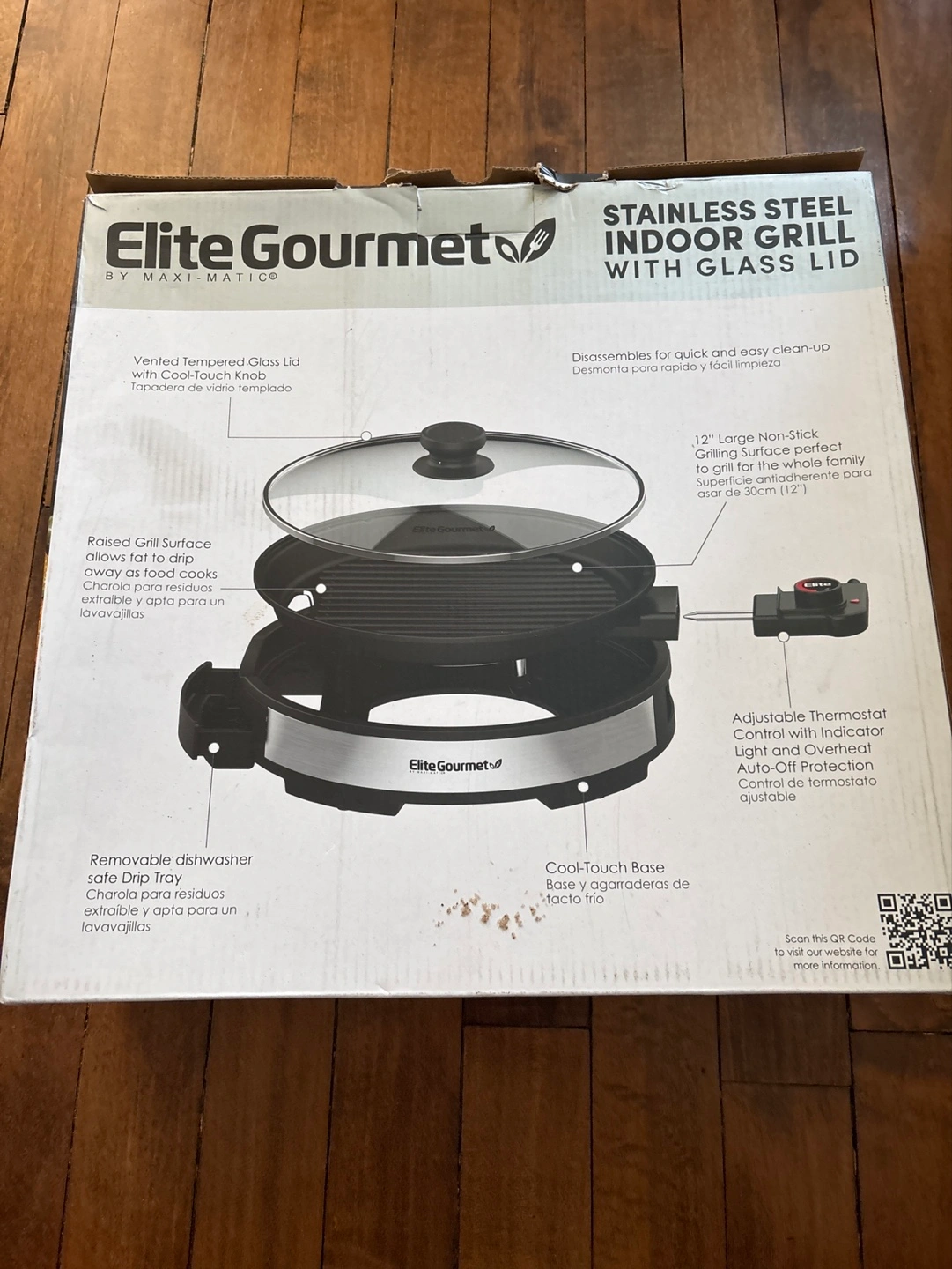 Brand new in box. Stainless steel indoor grill. Features glass lid, removable drip tray, and adjustable thermostat. Cool-touch base. Easy clean-up. 12-inch grilling surface.