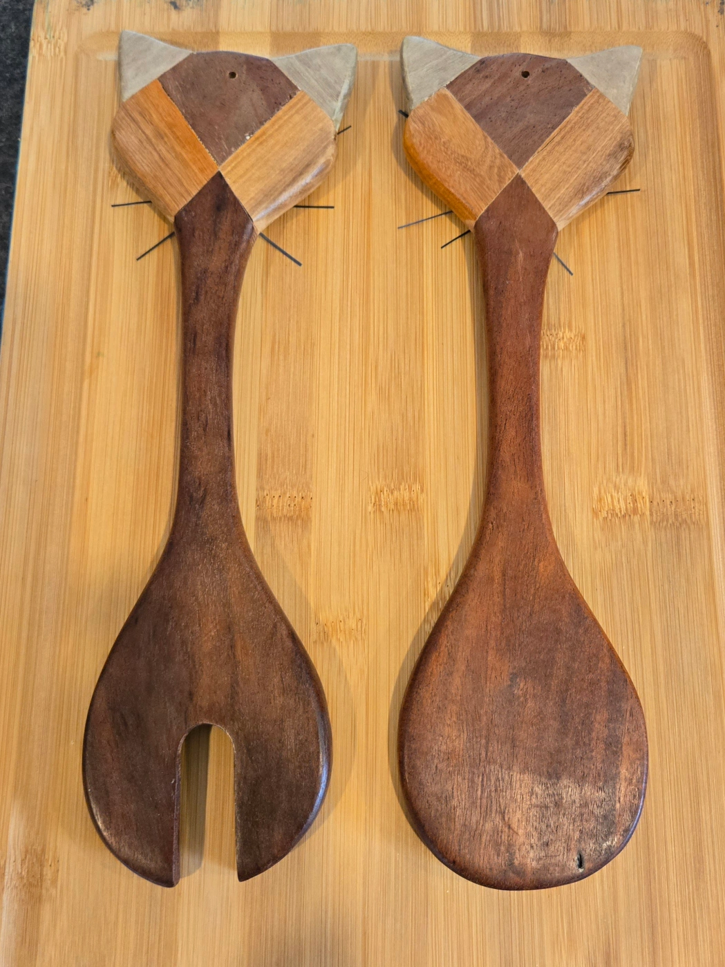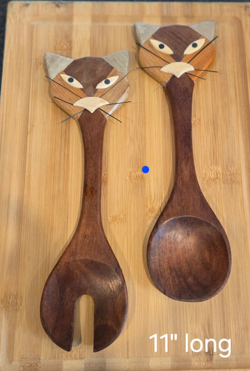 Pair of vintage handcrafted wooden salad servers. Cat faces. Dark brown wood. Unique and charming kitchen tools. Approximately 11 inches long.