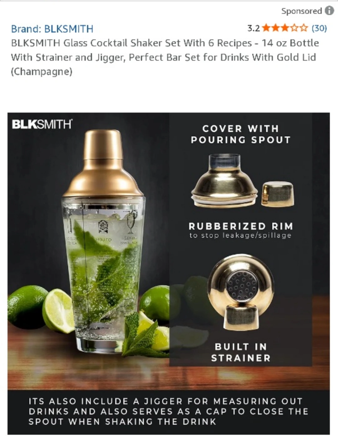 14 oz glass cocktail shaker. Gold-toned lid. Includes six cocktail recipes and measurements. Built-in strainer. Dishwasher safe. purchase $49+tax