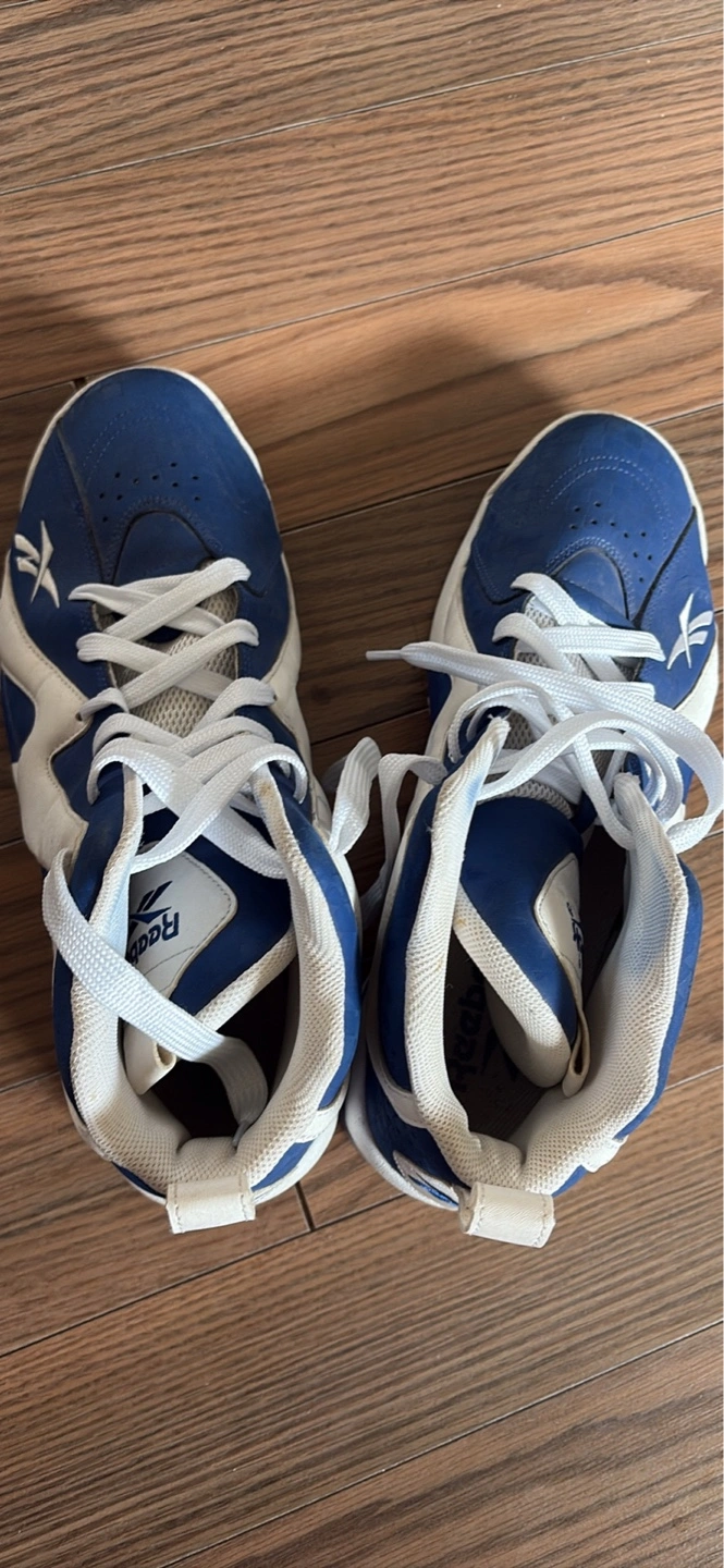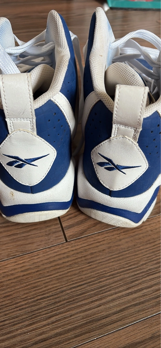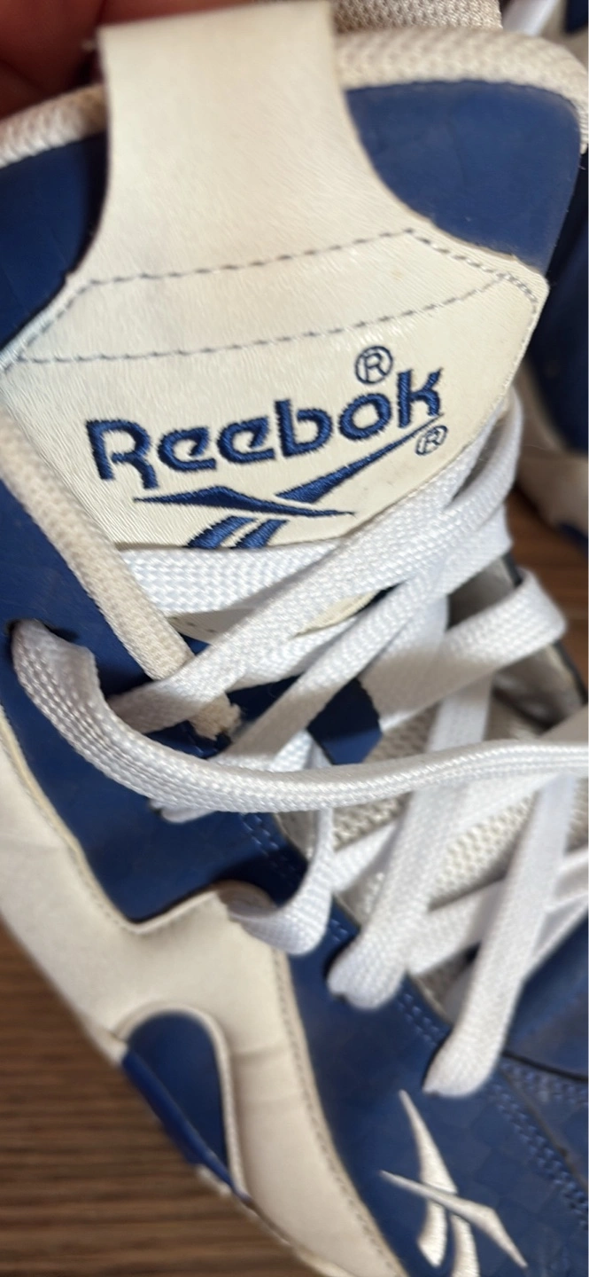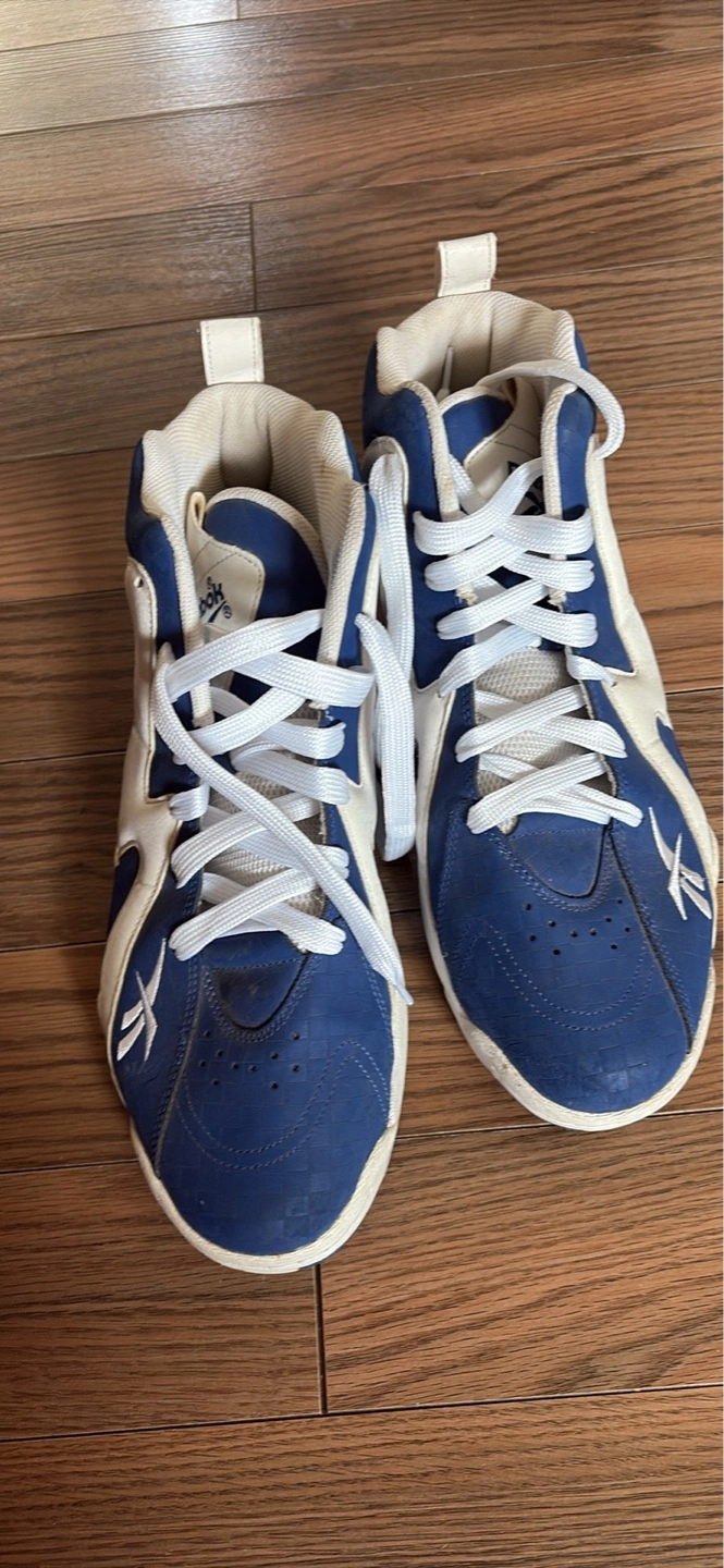Pair of used Reebok high-top basketball shoes. Blue and white colour scheme. Classic style. Good for casual wear or collecting.