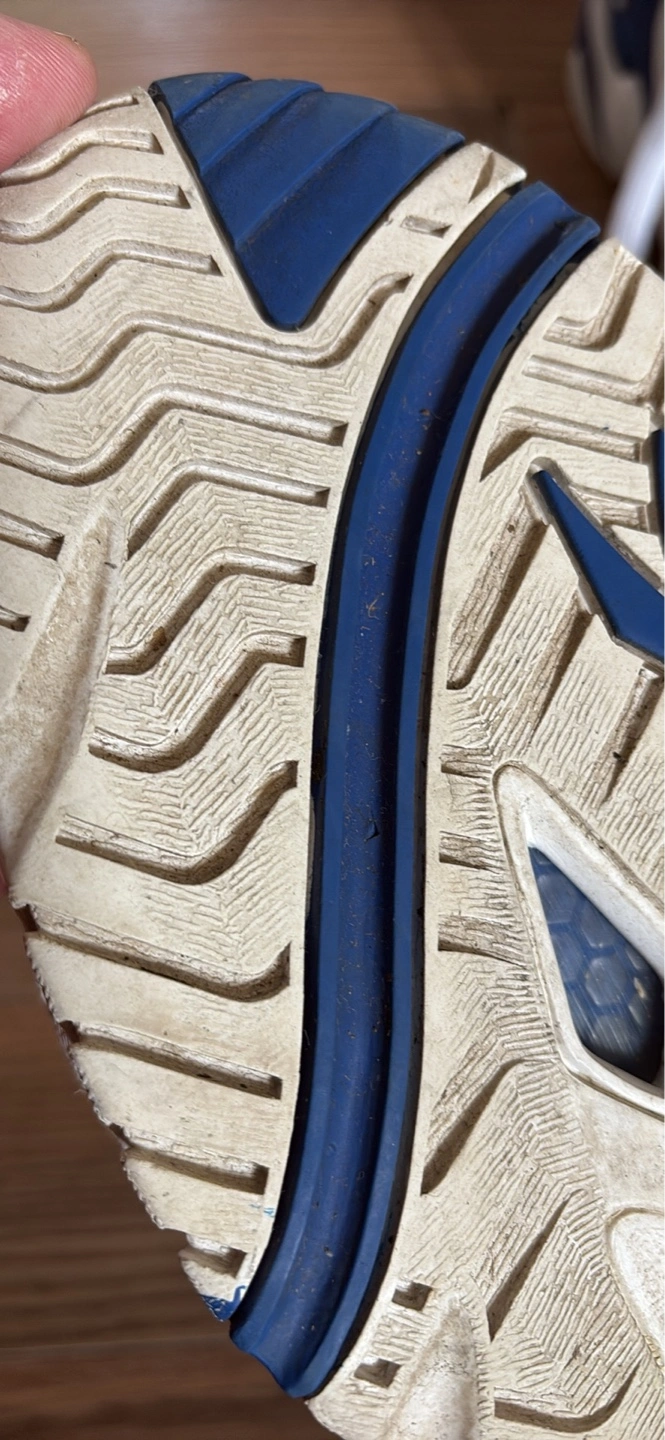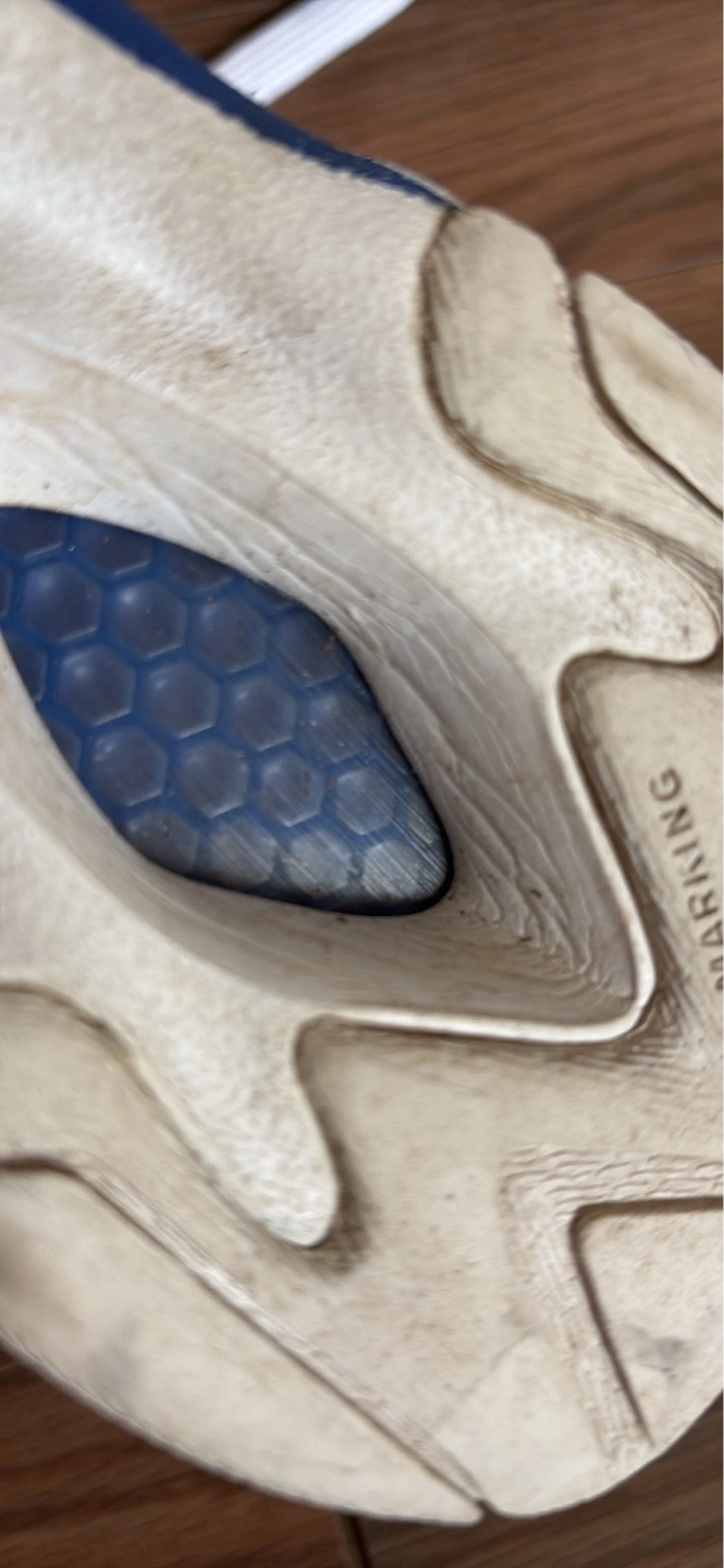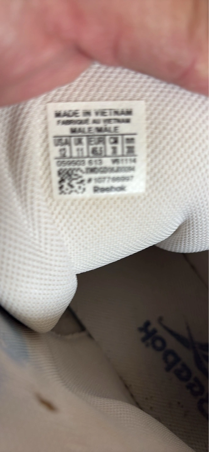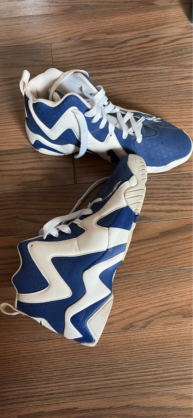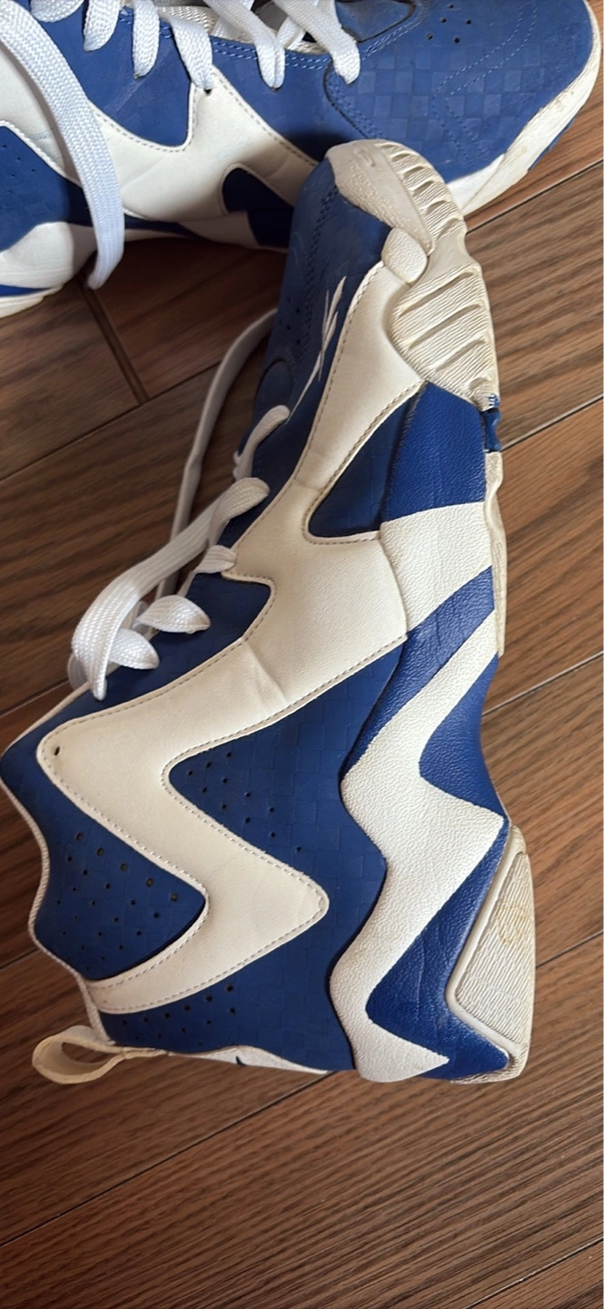 Pair of used Reebok high-top basketball shoes. Blue and white colour scheme. Classic style. Good for casual wear or collecting.