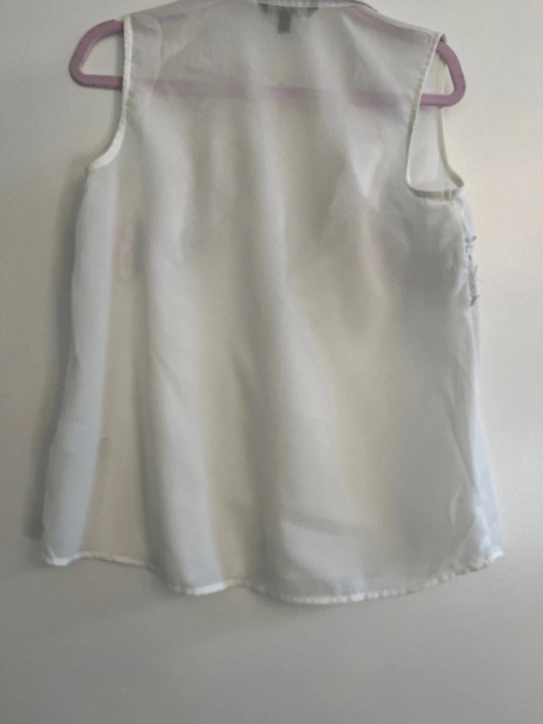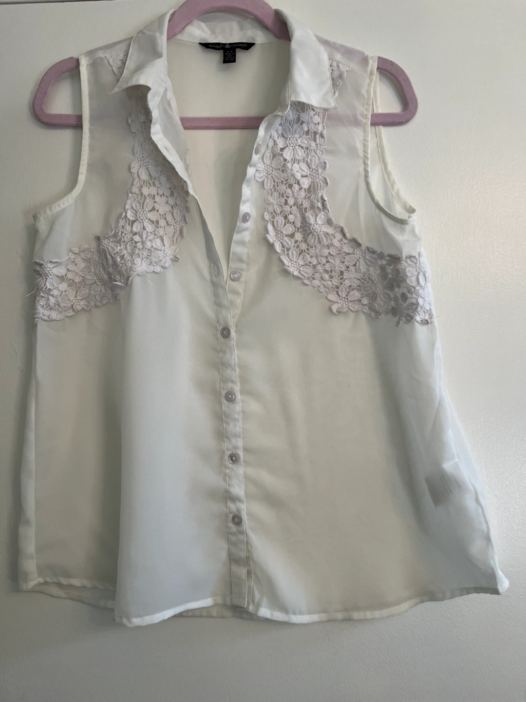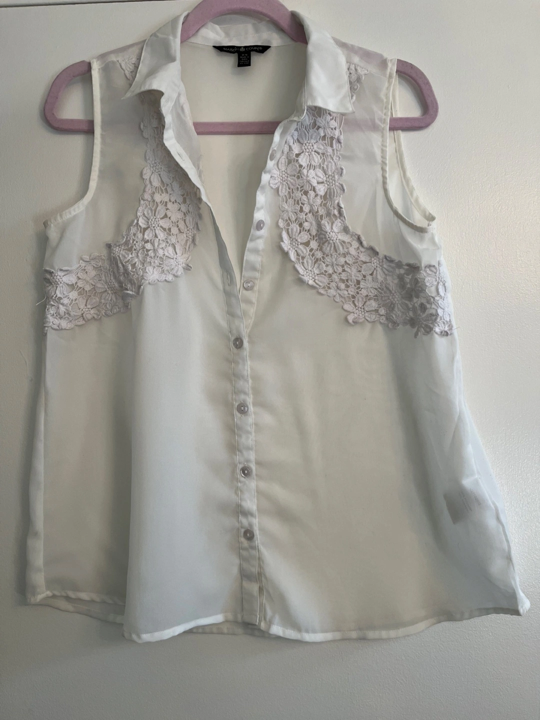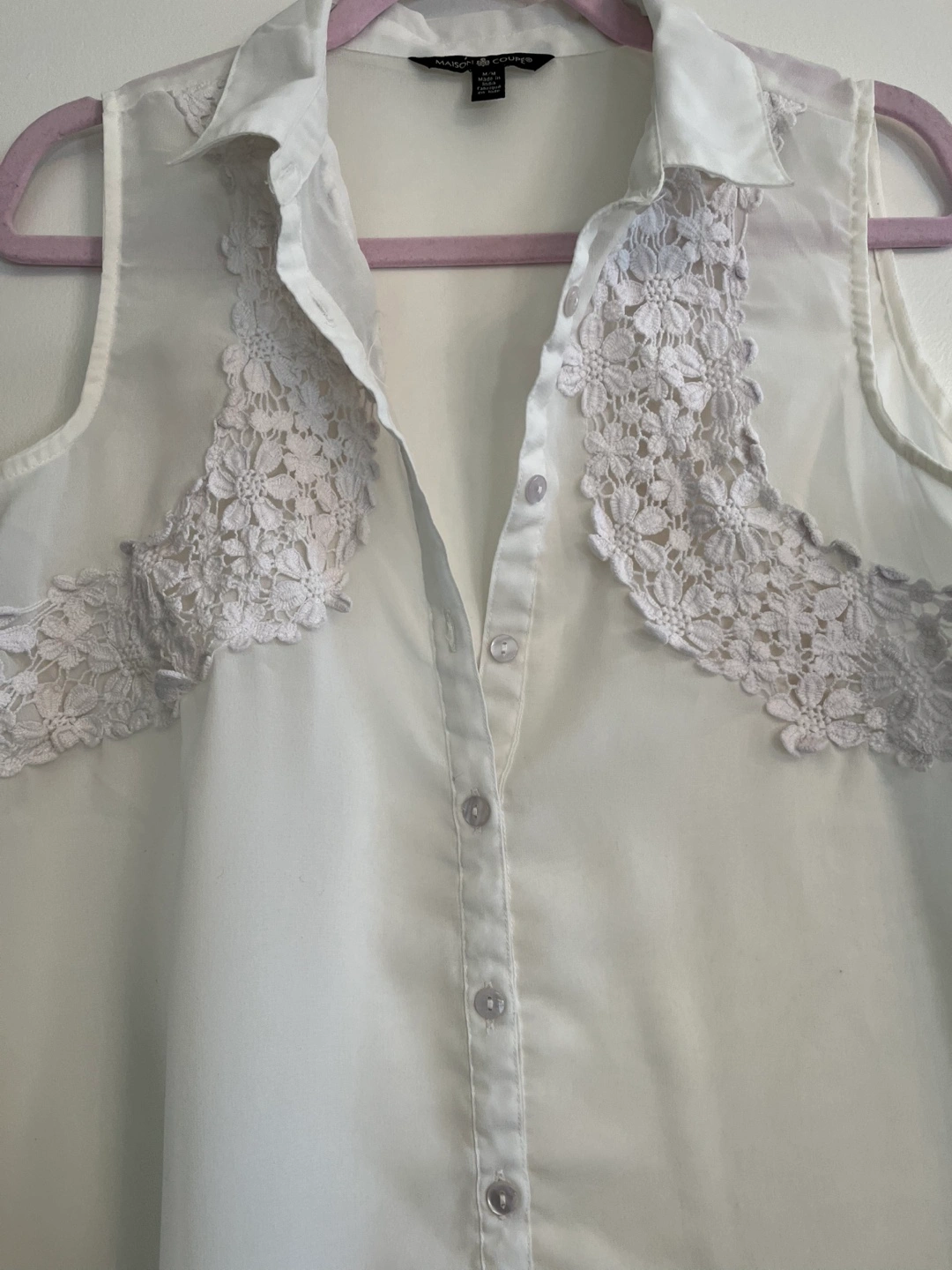 Women's sleeveless blouse. White with delicate white lace accents. Button-down front. Perfect for office