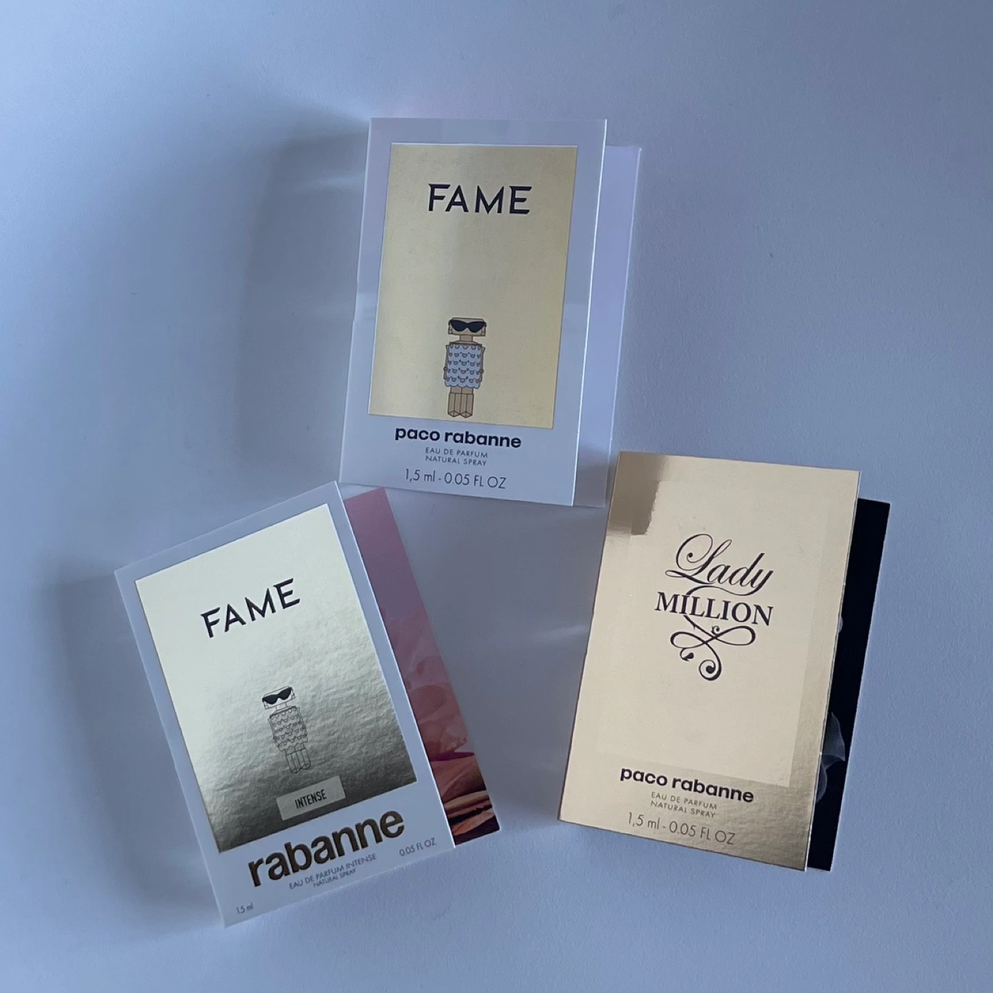 Three Paco Rabanne perfume samples. Includes Fame, Fame Intense, and Lady Million. Each sample is 1.5ml.