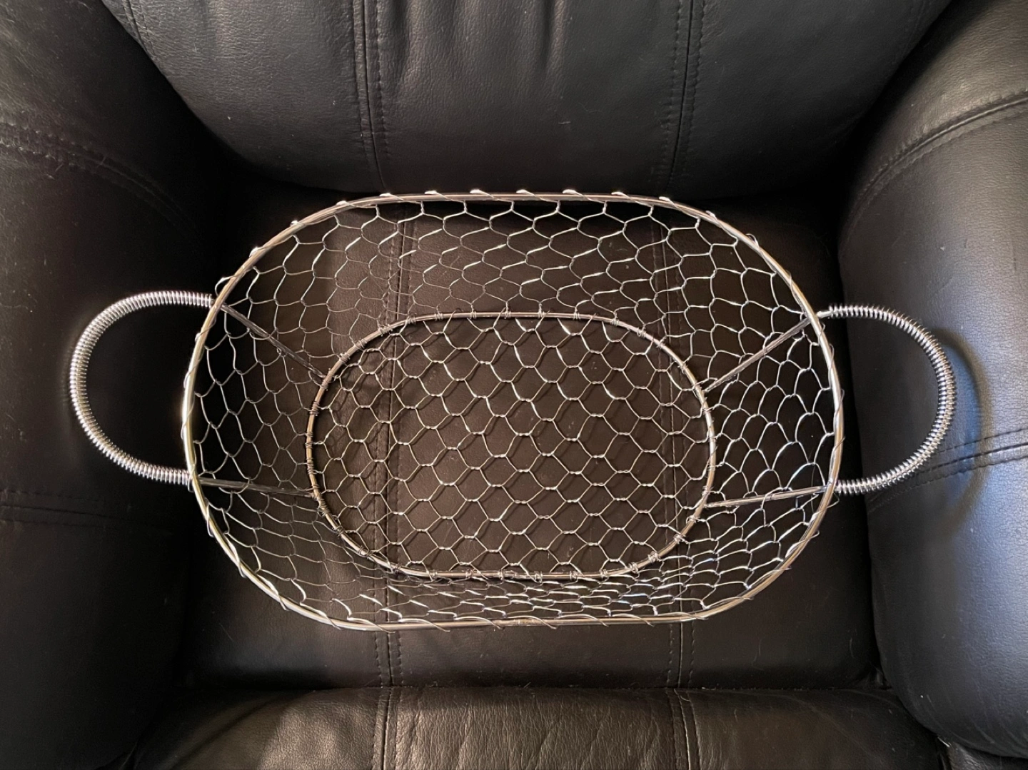 Oval-shaped wire basket. Silver metal. Features two wire handles. Chicken wire design. Perfect for storage or organization.