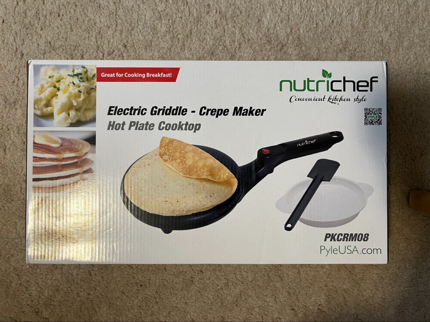 Condition: 100% brand new in box — never opened or used. Electric griddle, crepe maker, and hot plate cooktop. Includes spatula and small pan. Great for cooking breakfast.