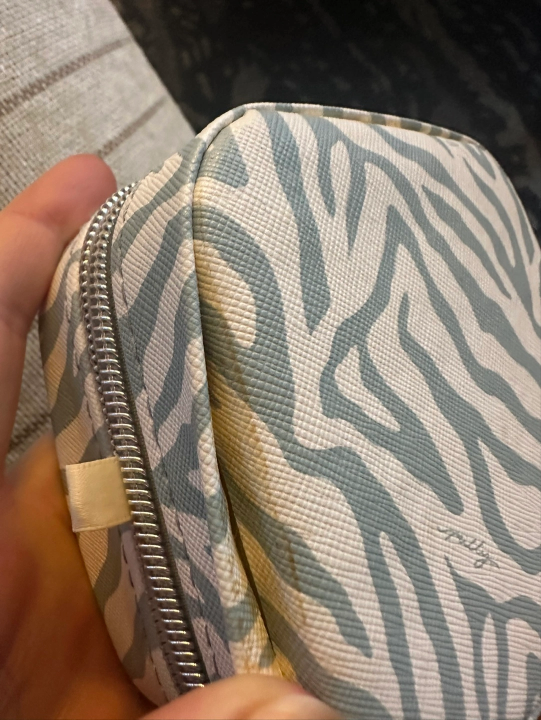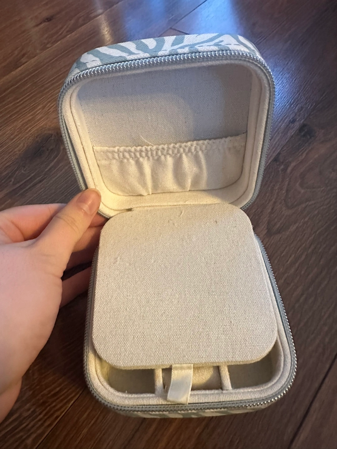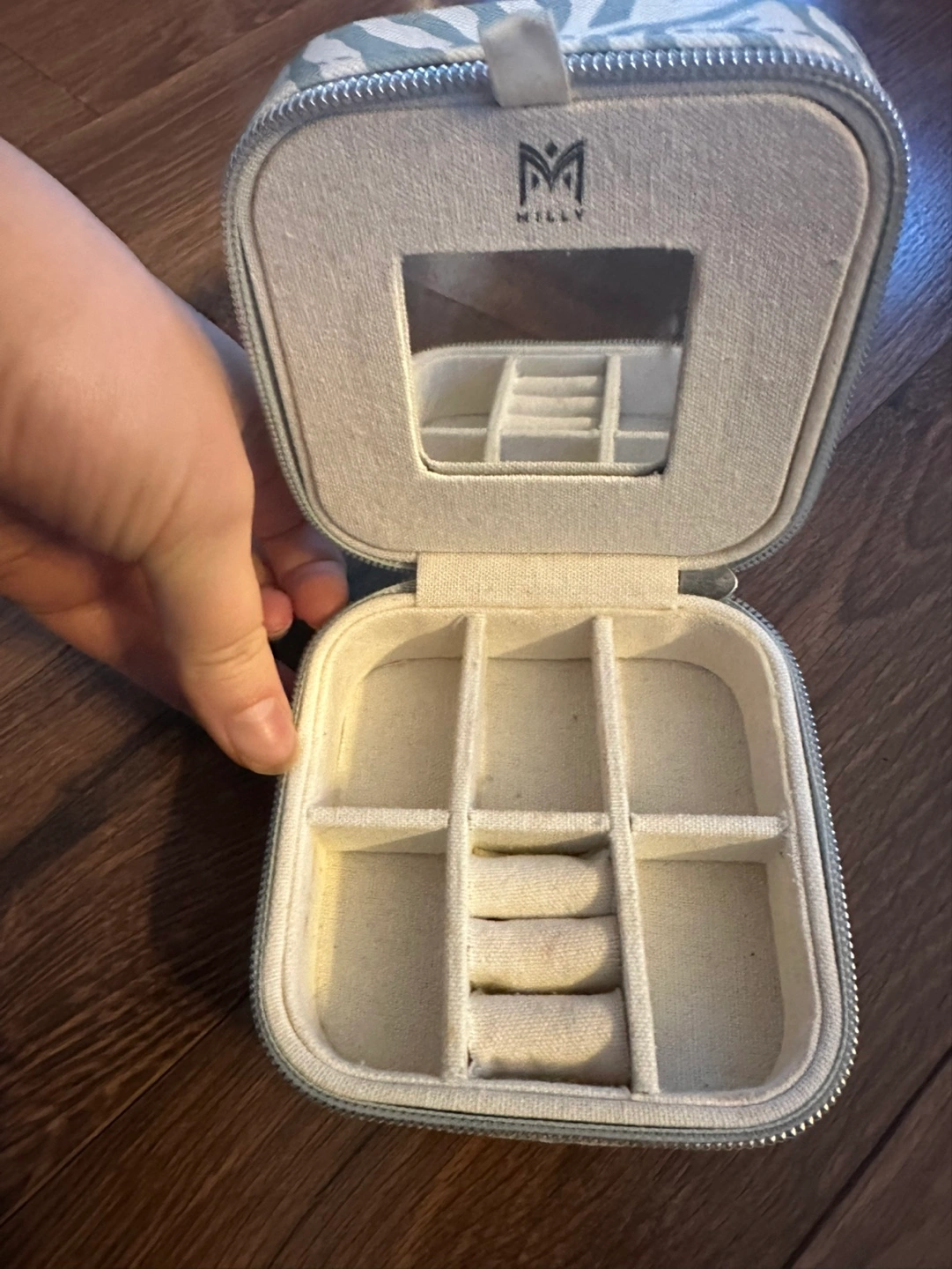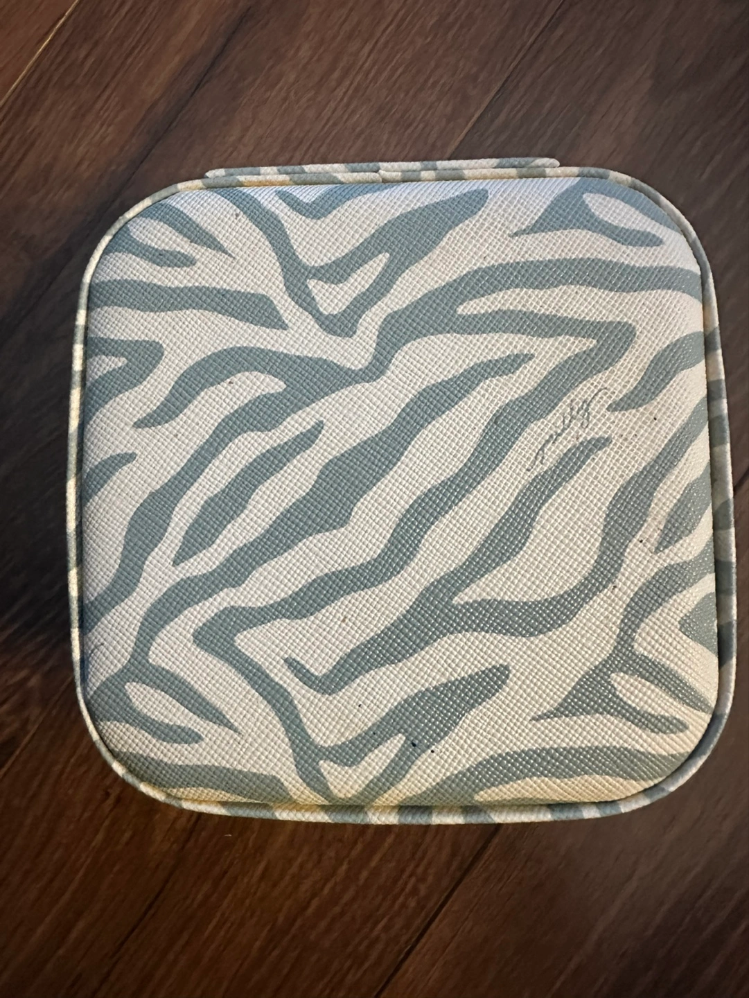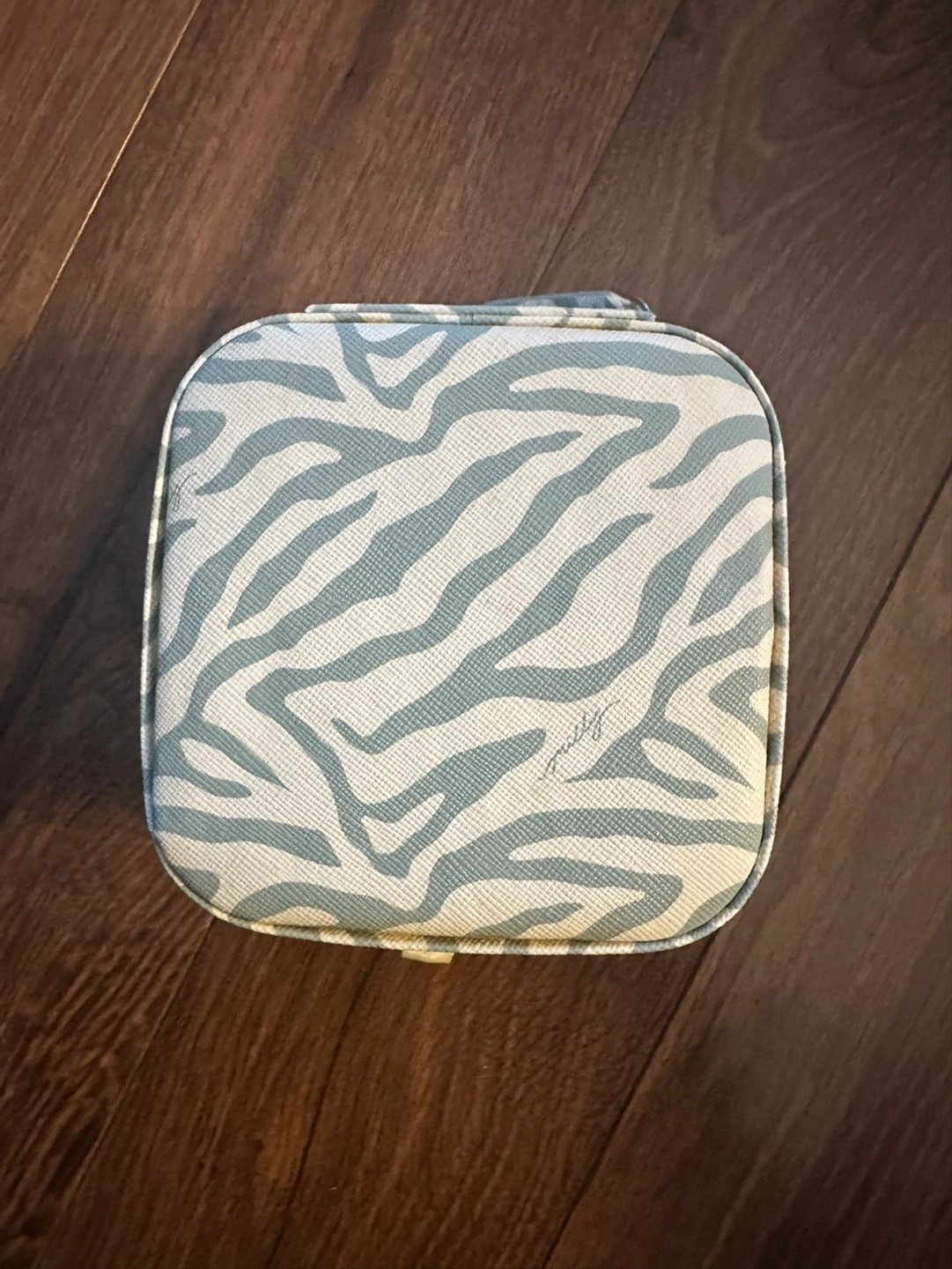 Small square jewellery case. Features a zipper closure, several compartments, and a small mirror. Zebra print design. Ideal for travel or organizing small jewellery items. Some wear, as pictured.