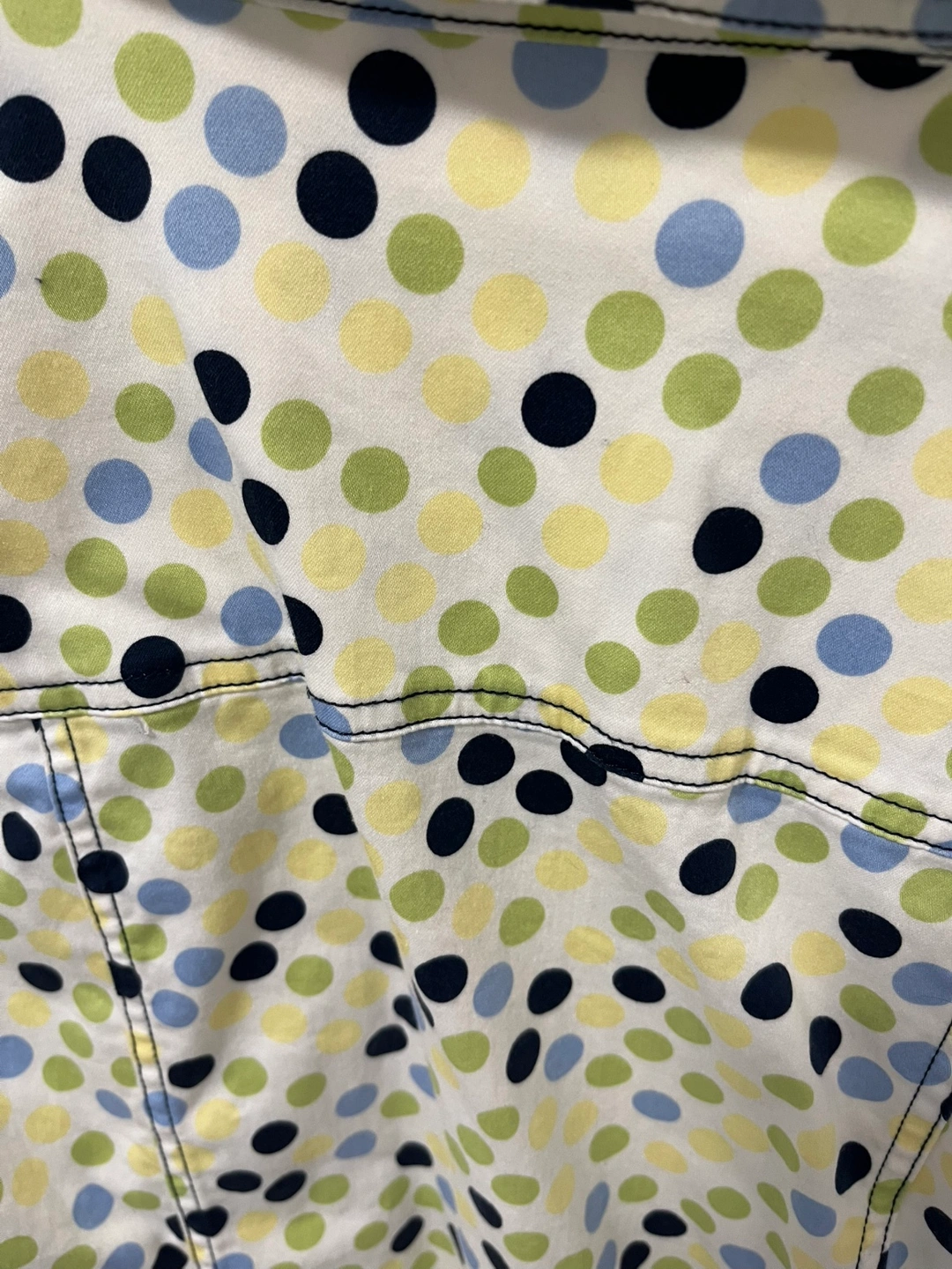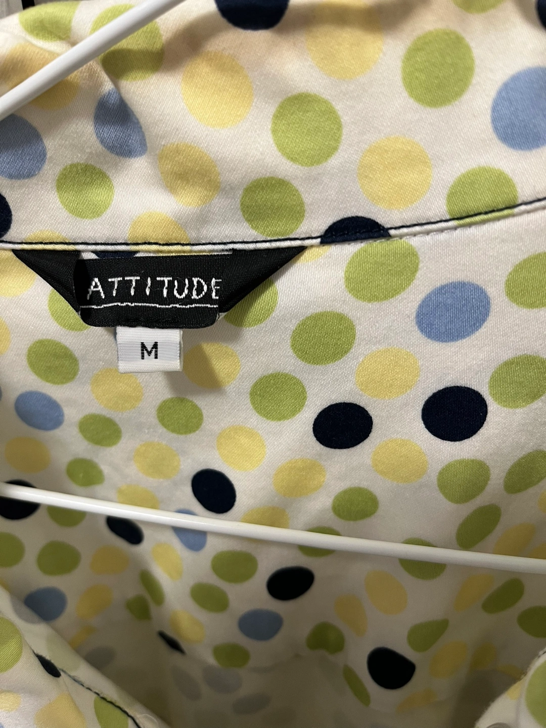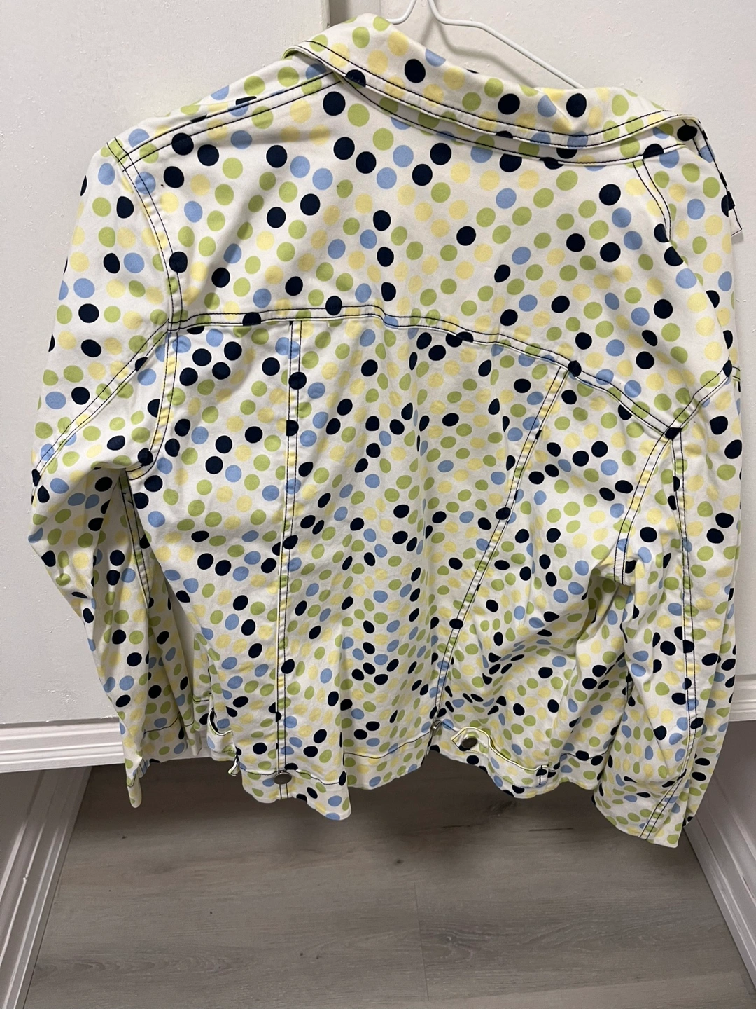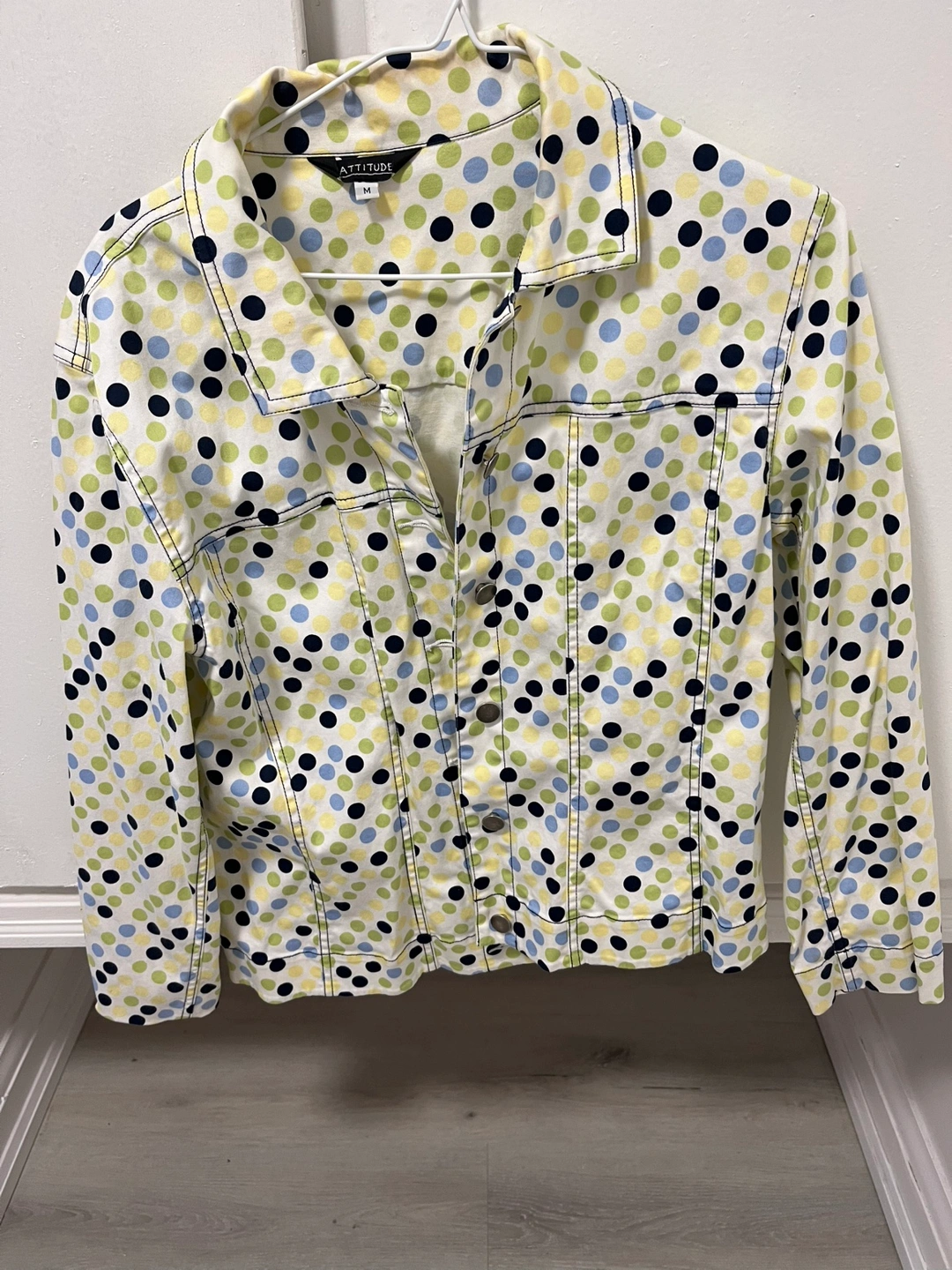 Women's medium-sized jacket. Polka dot pattern. Long sleeves. Button closure. Lightweight fabric.