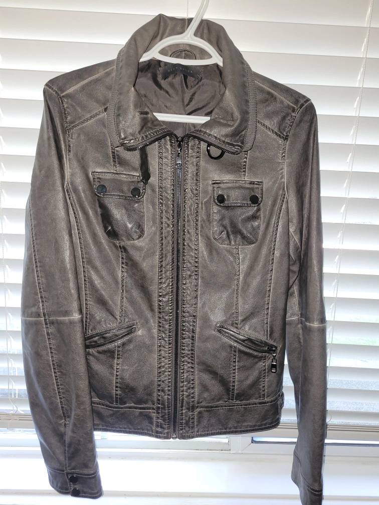 Women's grey faux leather jacket bought from Suzy Shier. Zipper closure. Multiple pockets. Long sleeves. New condition. Never worn.