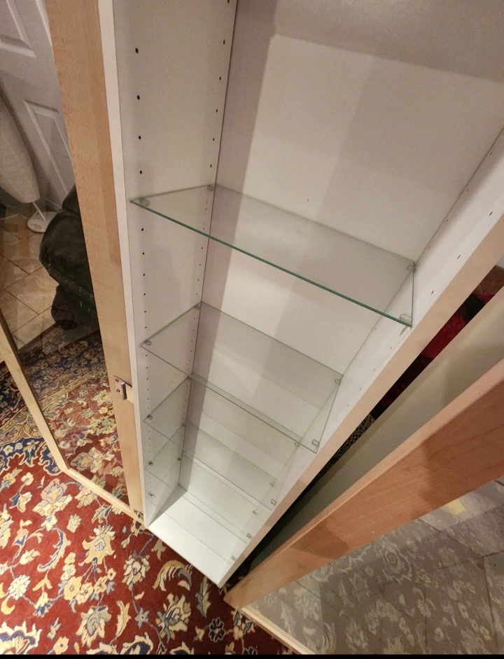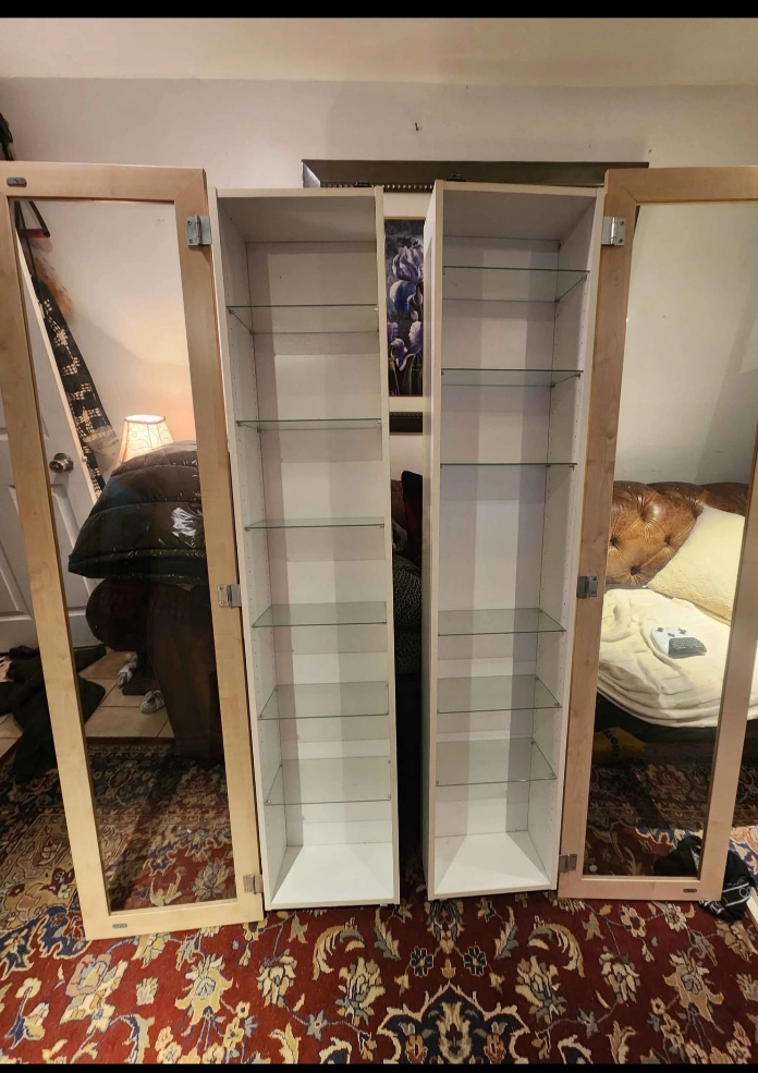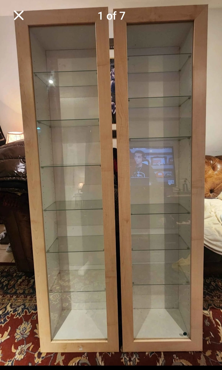 Add a touch of elegance to your home with this pair of used IKEA Bertby cases with safety glass doors! These are great for showcasing your favorite collectibles, or dinner ware. This used set comes complete with adjustable glass shelves. One is in perfect condition. The other has a scuff mark at the bottom(see last pic) Features: * Adjustable shelves * Safety glass doors for display Ready to give your treasures a stylish home? And remember, if you're reading this, they're still available!