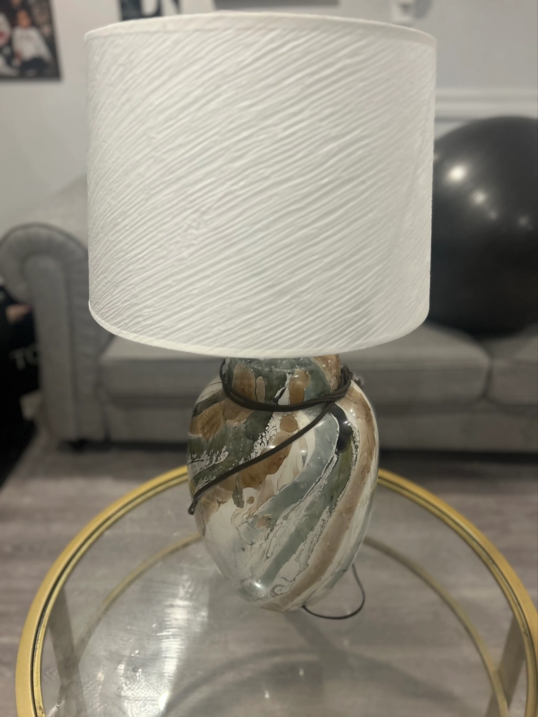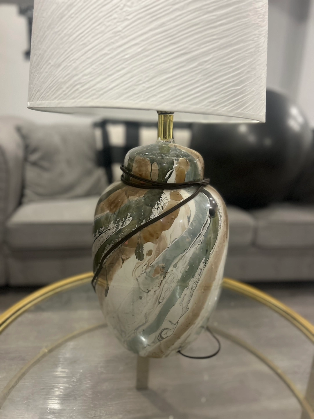 Beautiful table lamp. Features a swirled, marbled design base in greens, browns, and whites. White fabric shade. Vintage lamp, 150 pick up south Walkerville or can meet at location listed !