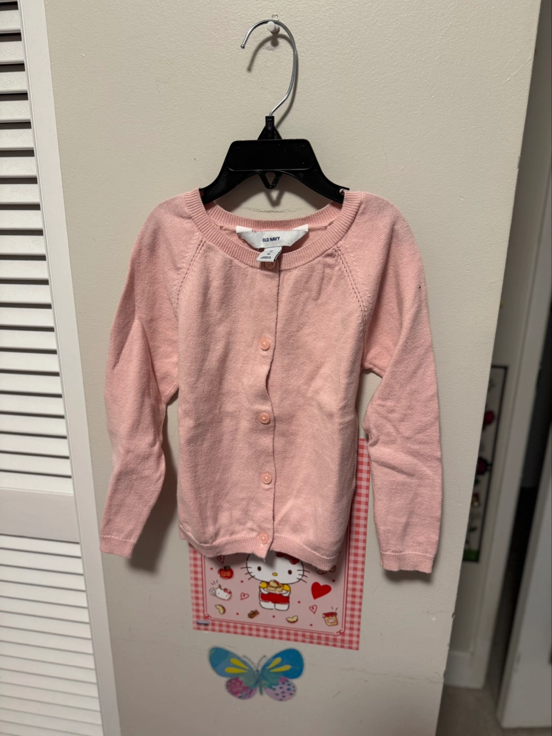 Adorable pink cardigan. Long sleeves, button closure. Great for layering.