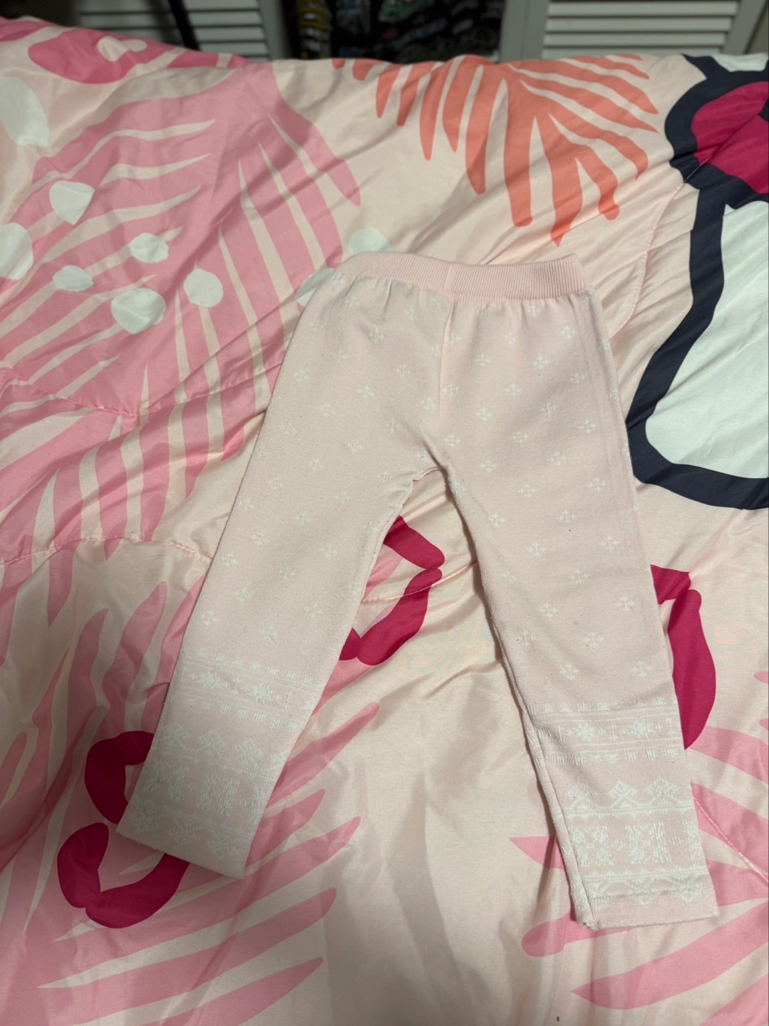 Adorable baby girl leggings. Pink knit fabric. White snowflake pattern. Soft and comfortable.
