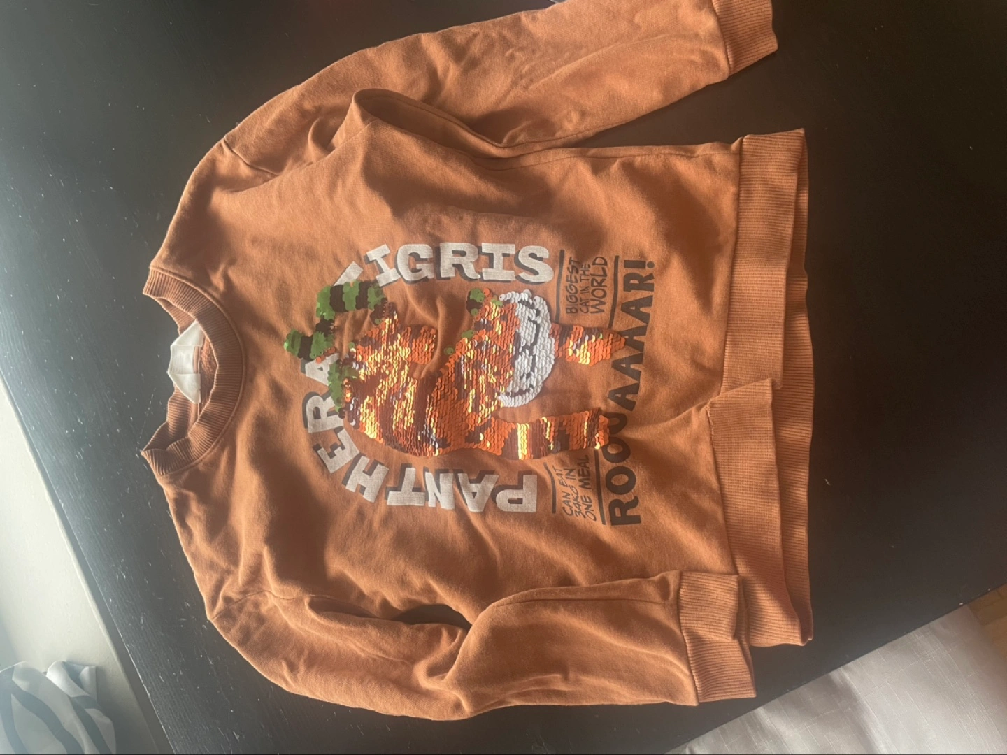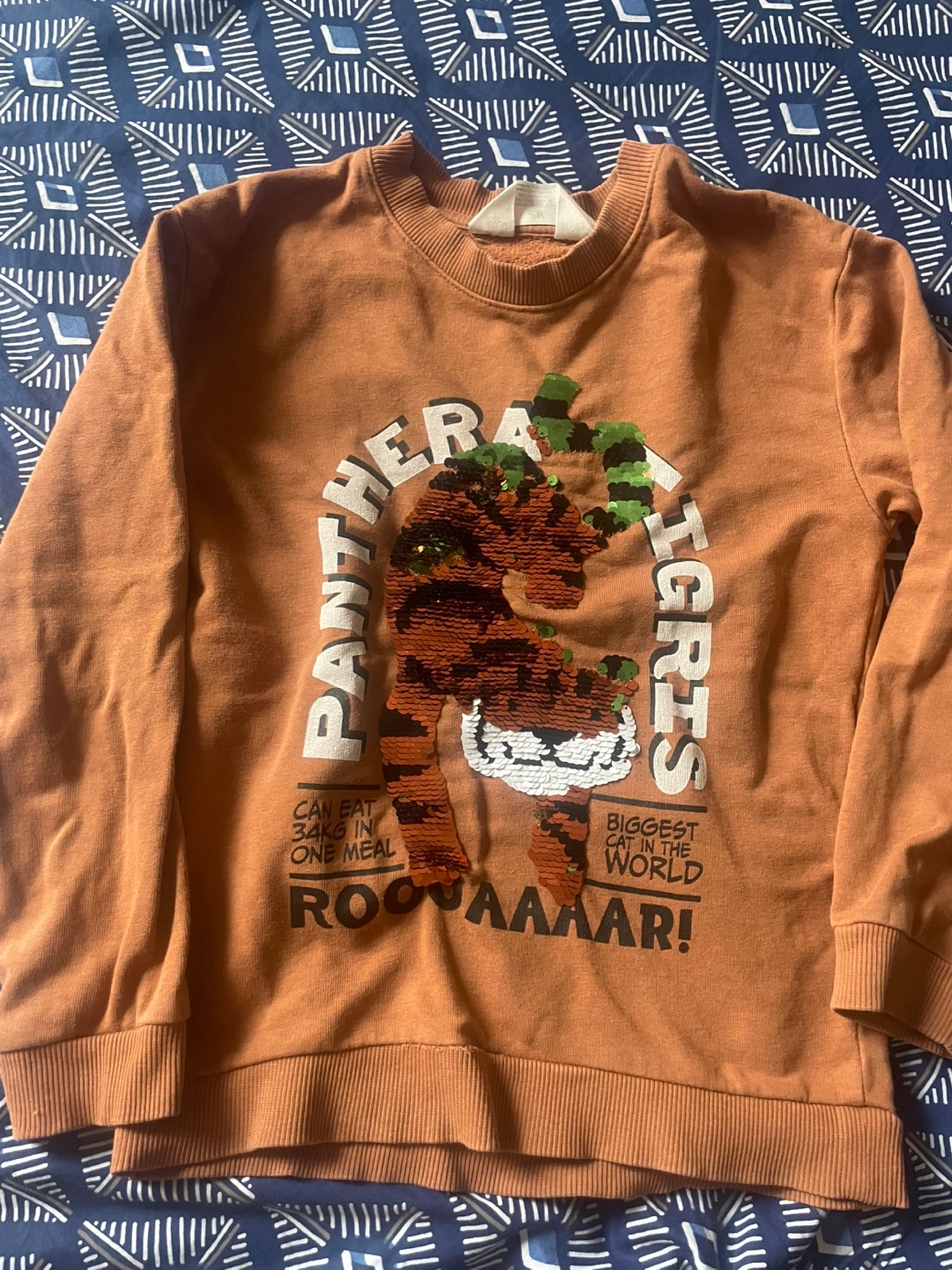 Adorable brown sweatshirt. Features a sequined tiger graphic. Crew neck. Long sleeves. Great for fall and winter.