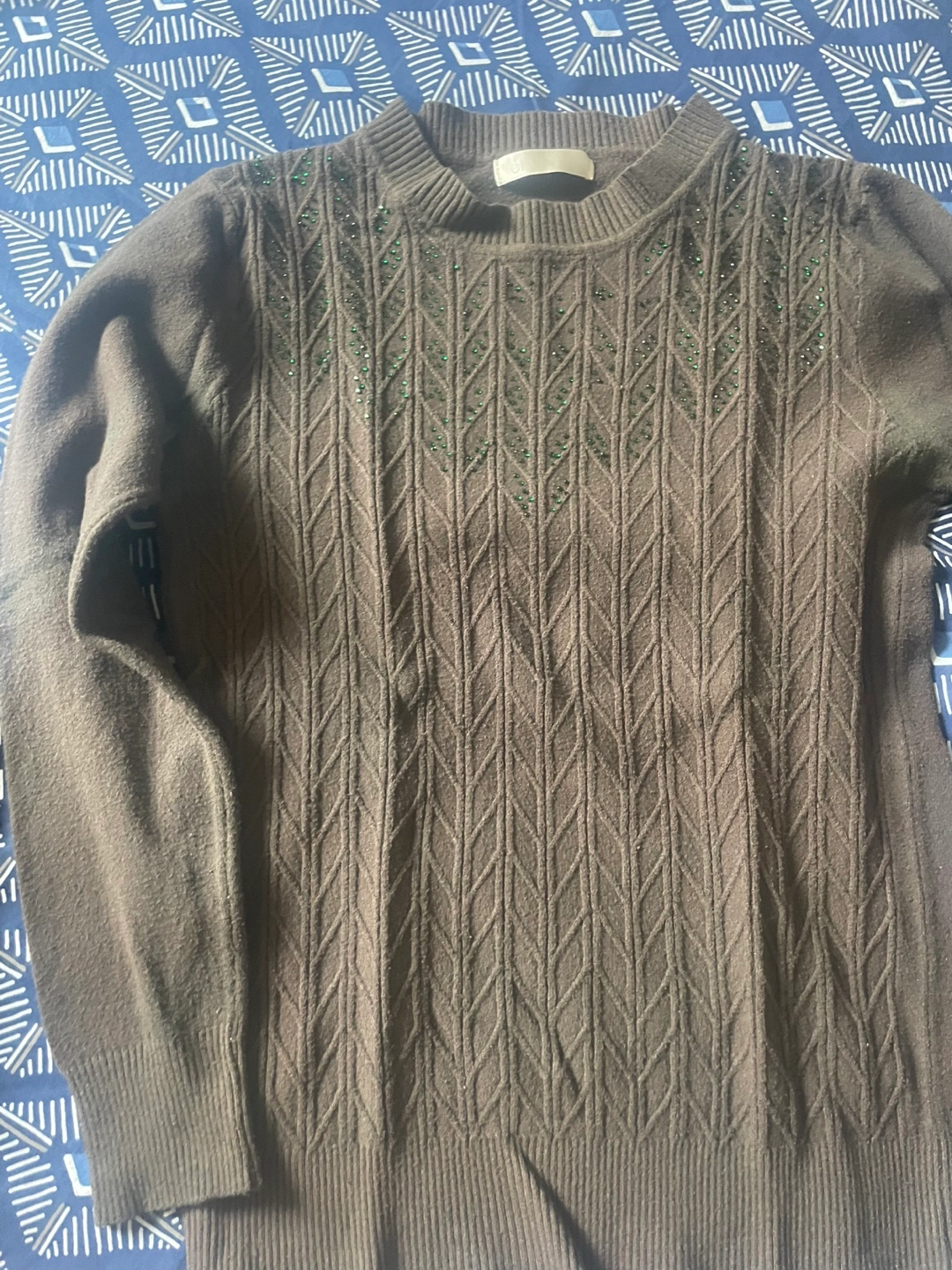 Long sleeve dark brown sweater. Cable knit design. Green embellishments on the shoulders. Size medium.
