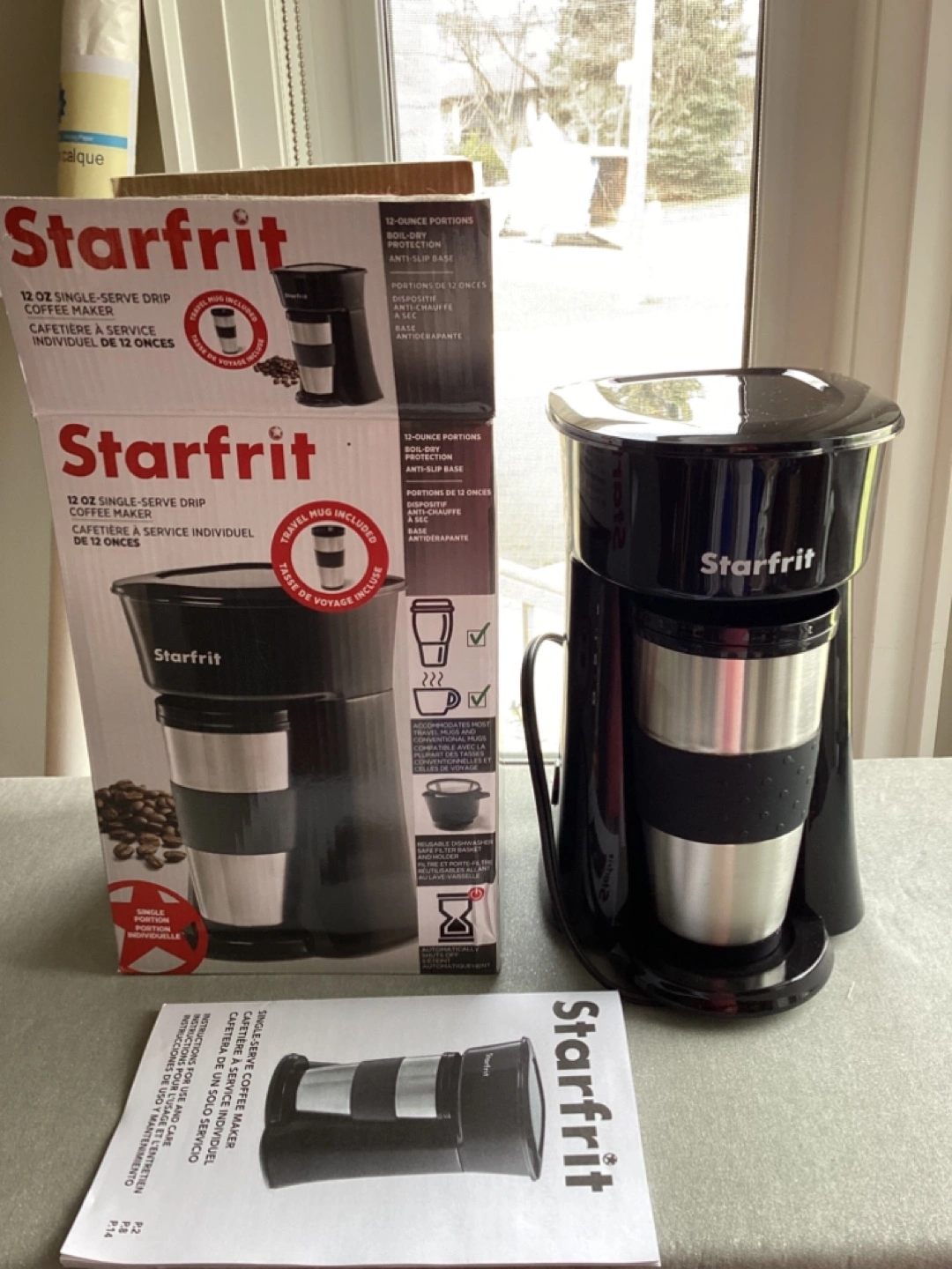 Brand New Starfrit single-serve coffee maker, includes travel mug, 12-ounce portions, boil-dry protection, anti-slip base, $30 brand new in store, $20 or best offer.