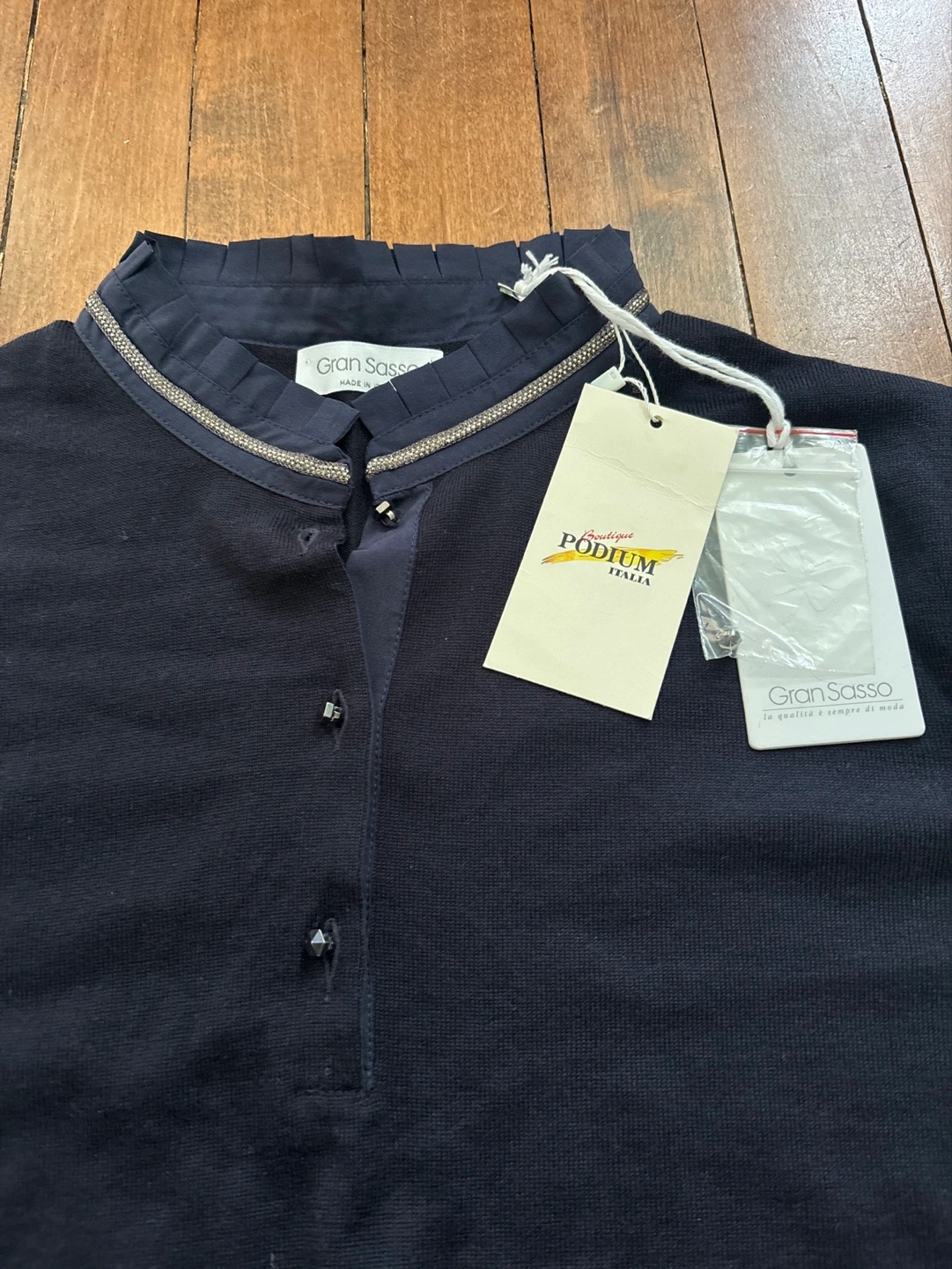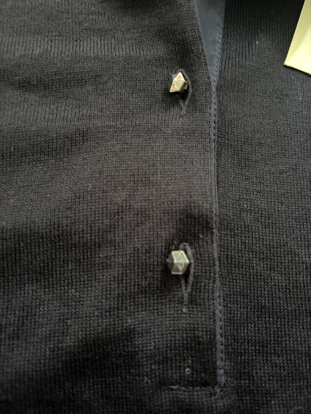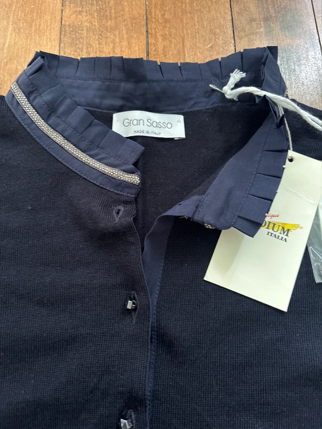 Long-sleeved navy blue cardigan. Features a unique embellished collar and cuffs. Made in Italy. Size not specified. New with tags. Aside M/L