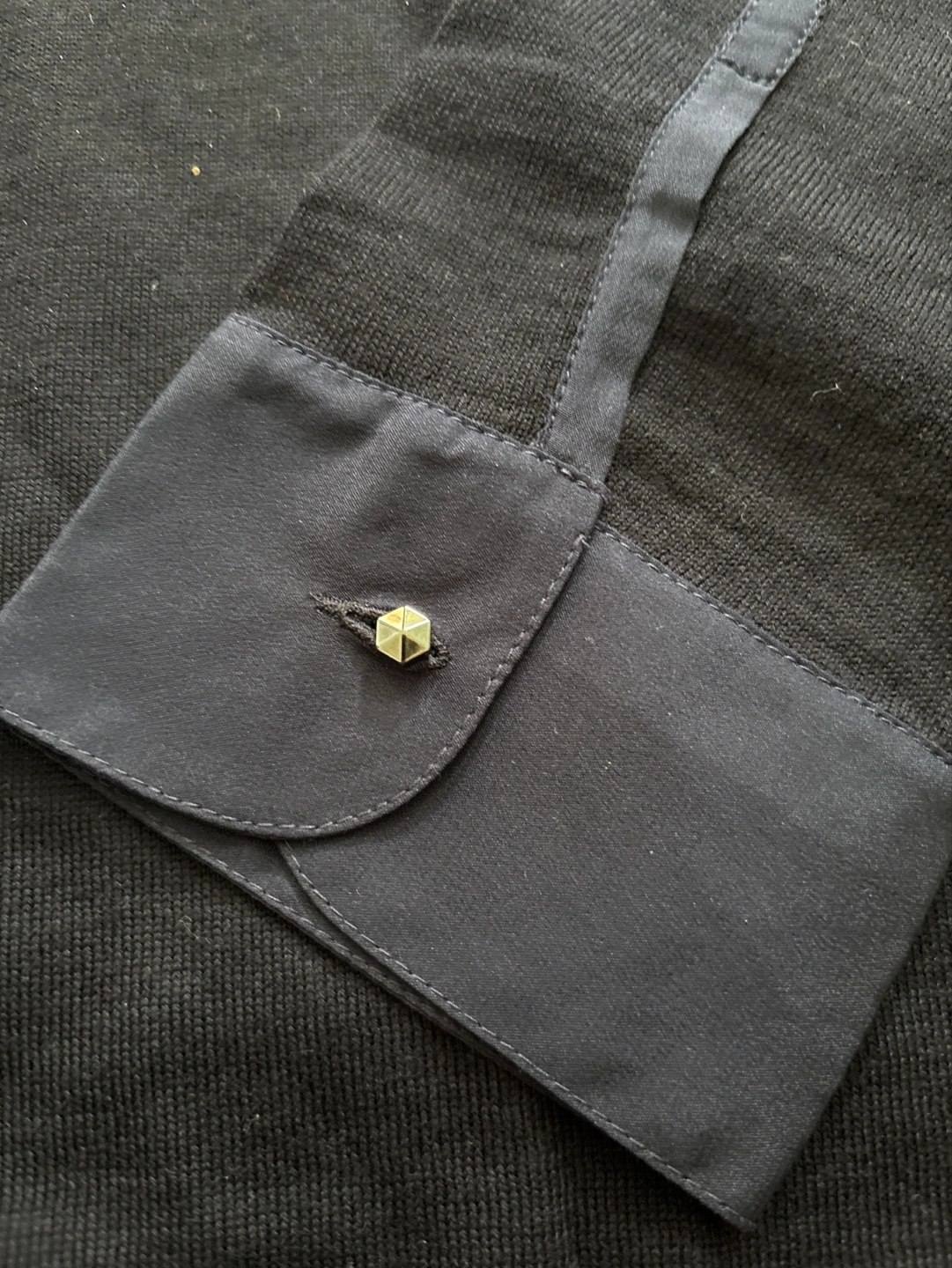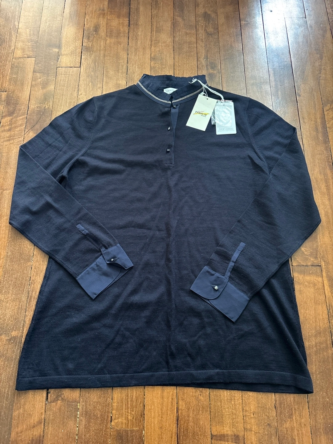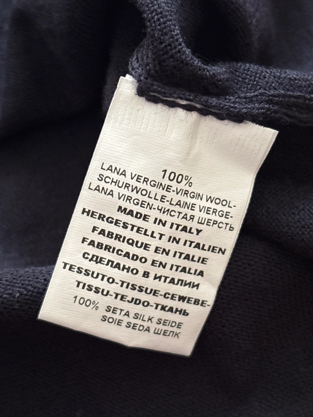 Long-sleeved navy blue cardigan. Features a unique embellished collar and cuffs. Made in Italy. Size not specified. New with tags. Aside M/L