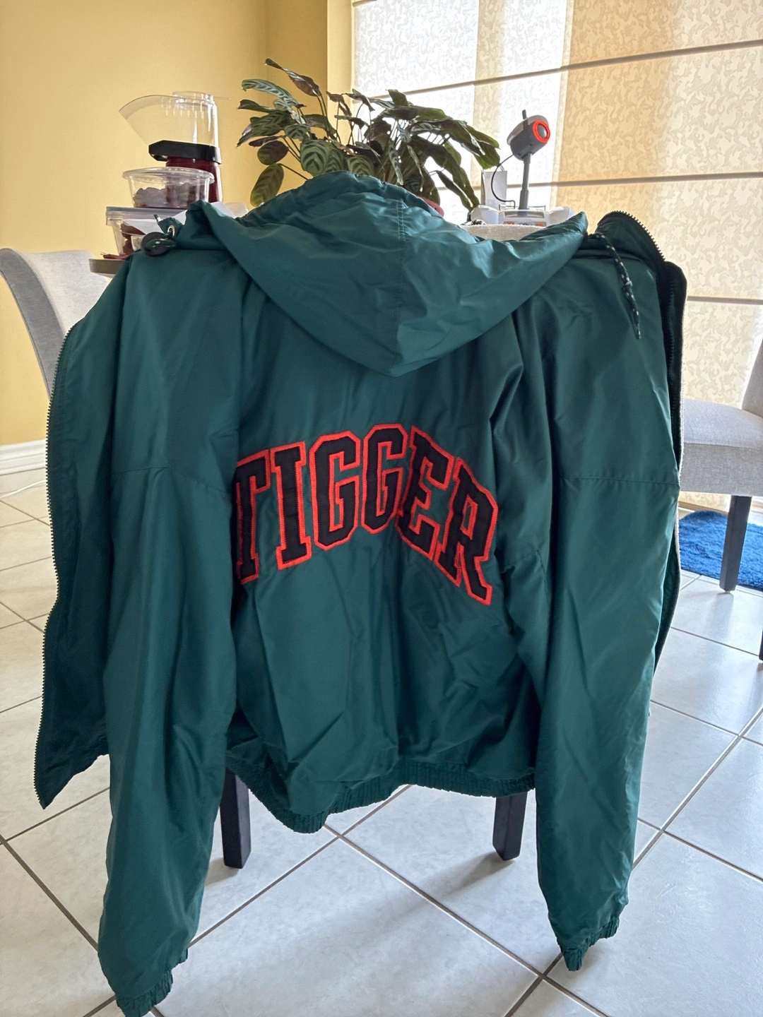 Green and grey reversible jacket. Features Tigger graphic and quote on the reverse side. Hooded. Adult size.
