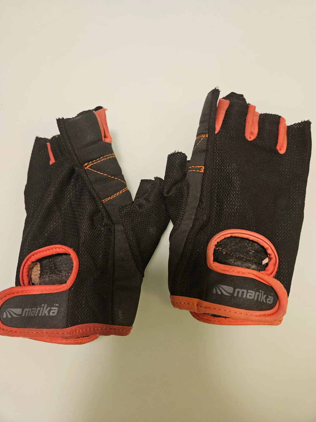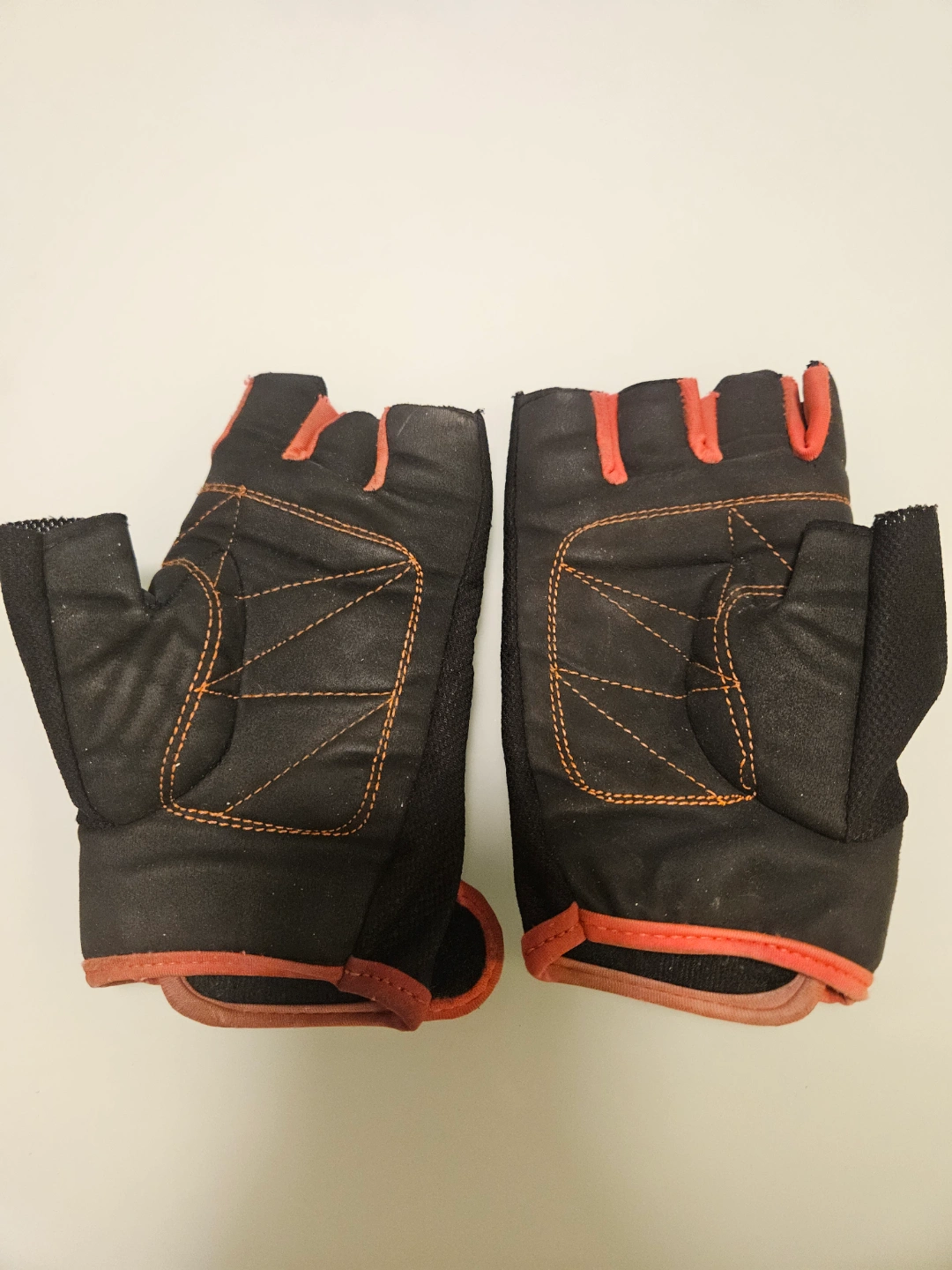 Pair of fingerless workout gloves. Black with orange accents. Good for weightlifting or other gym activities. Slightly used.