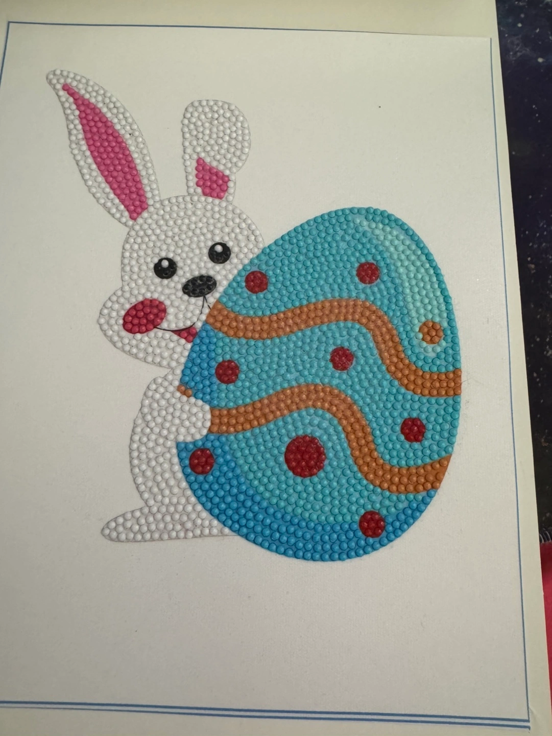 Cute Easter bunny holding a decorated egg. Finished diamond painting. Suitable for framing.