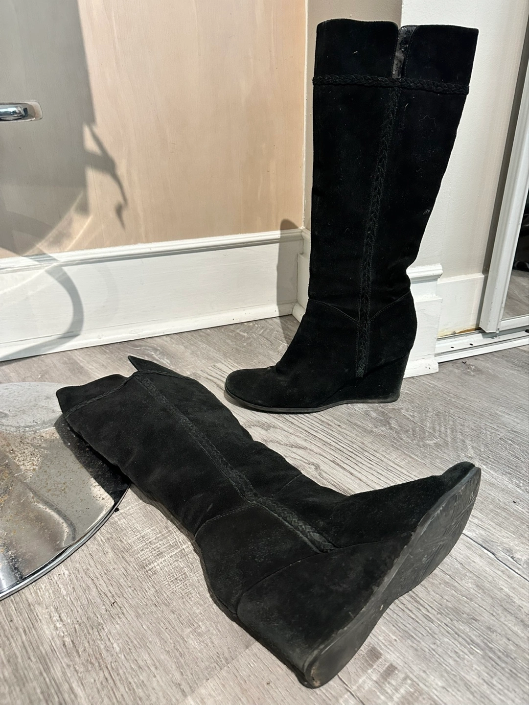 Day 4: Pair of black suede wedge boots. Knee-high. Braided detail at the down the outside of boot. Zip closure. Worn but good condition.