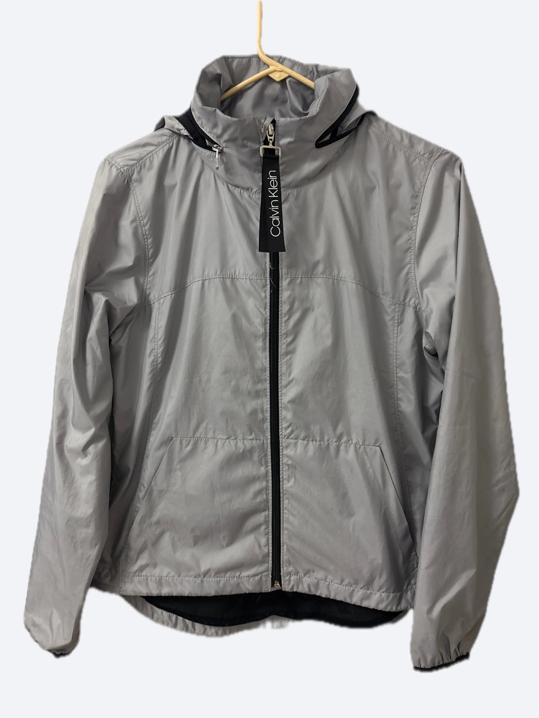 light grey hooded jacket. Zip front closure. Black accents. Size large. Great for layering.