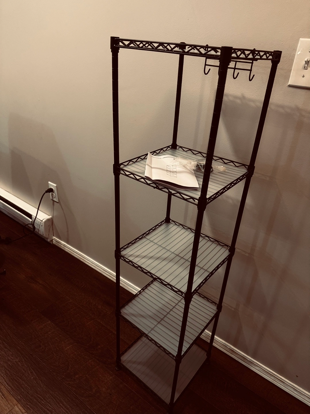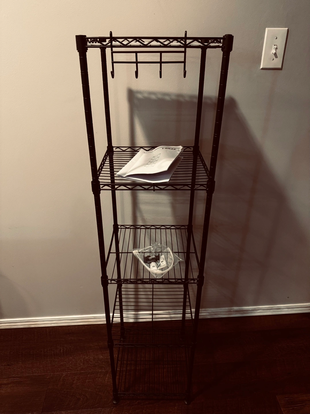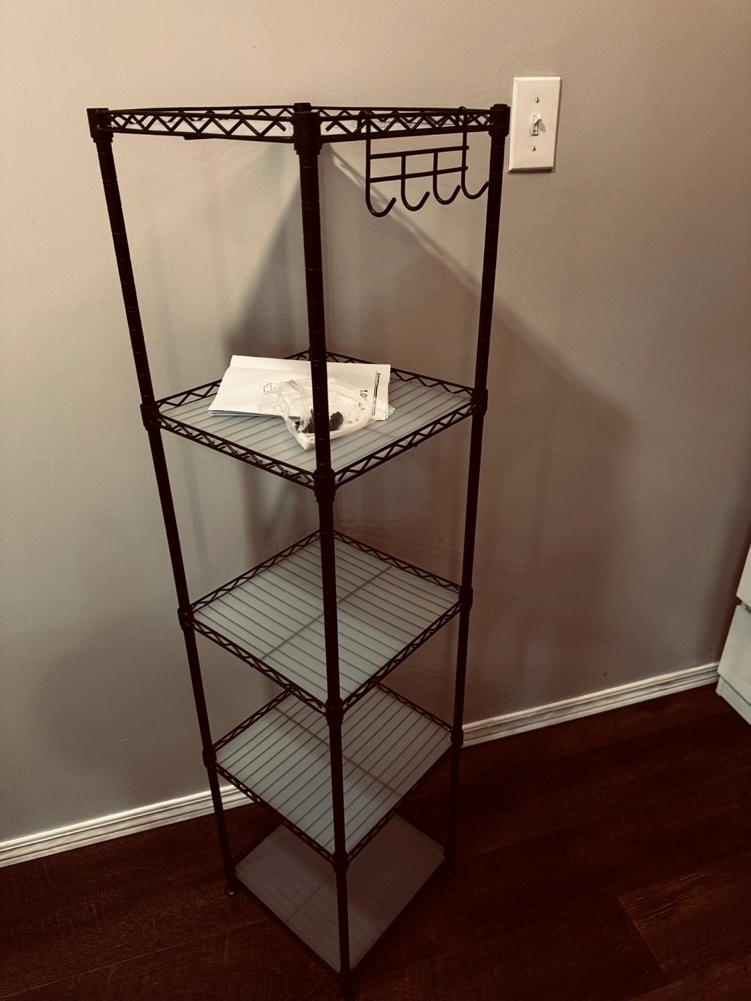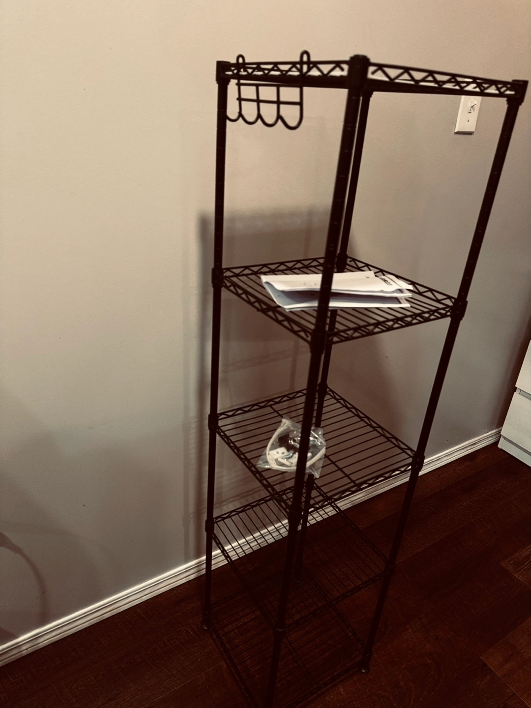 Four-tier shelving unit, black metal frame. Includes hooks. New in box, some assembly required. Instructions included.
