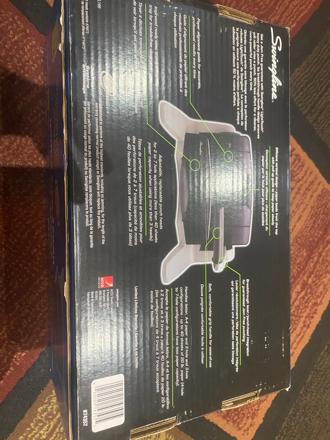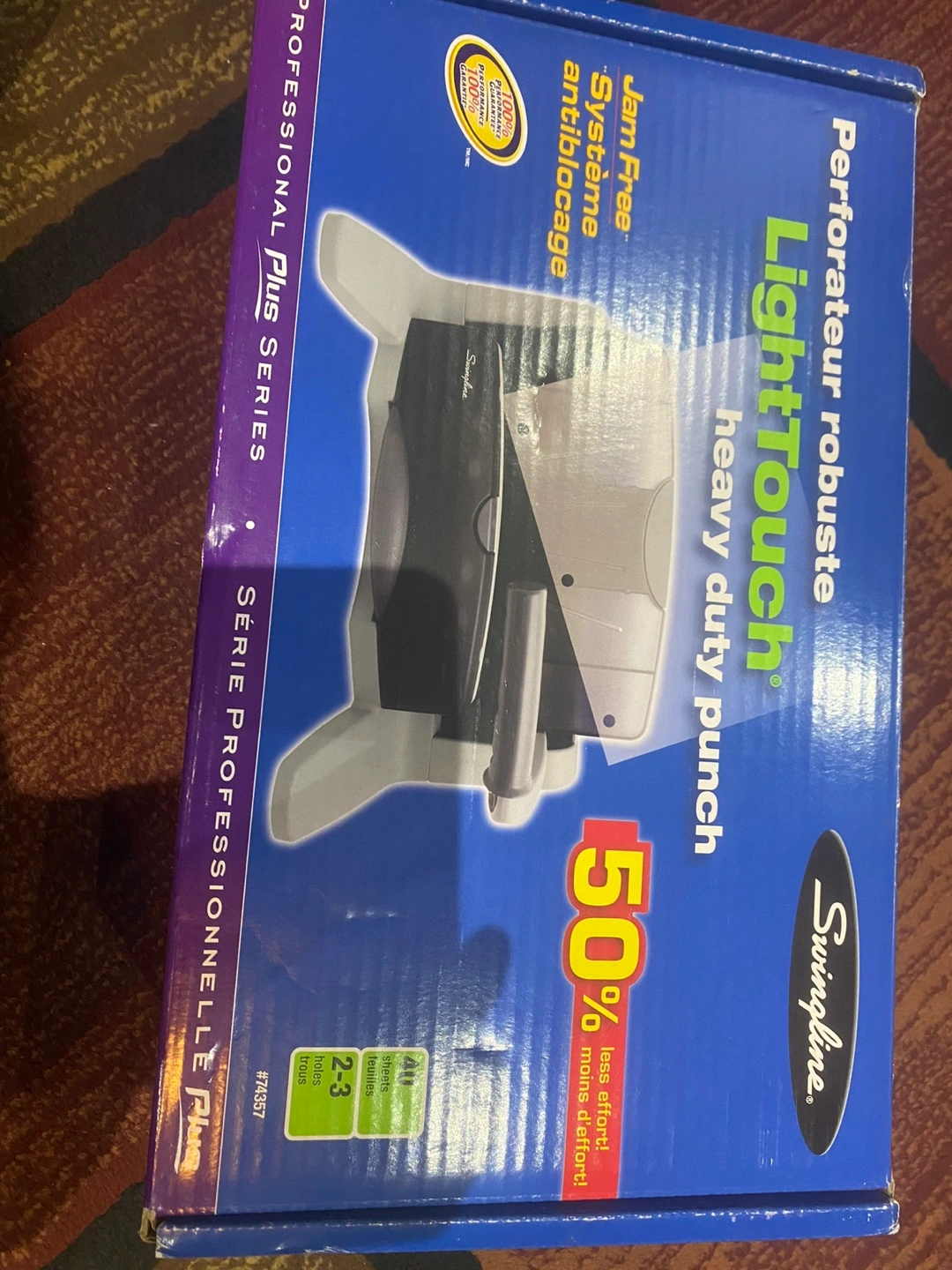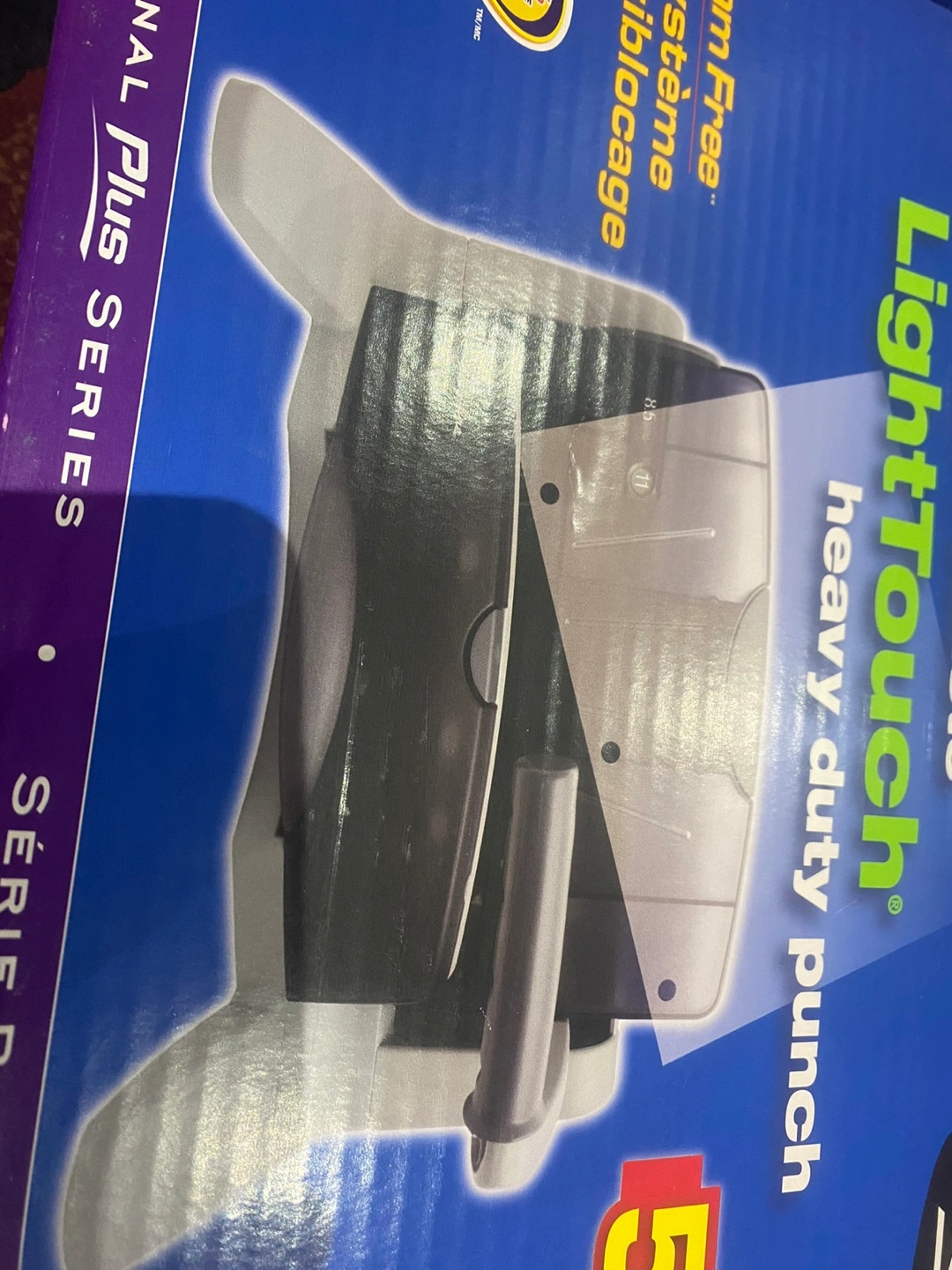 Heavy-duty paper punch. New, still in original packaging. Professional Plus Series. Jam-free anti-blockage system. Adjustable position for 2, 3, or 4 holes. Accommodates up to 40 sheets of paper. 50% less effort. Brand new