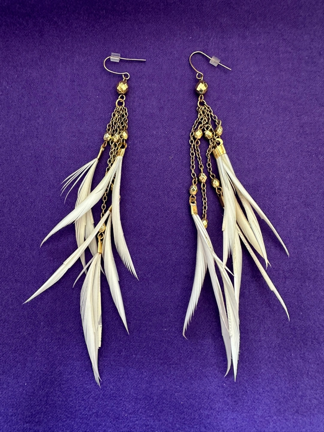 Beautiful long dangle earrings. Features white feathers and gold chains with beads. Perfect for adding a touch of bohemian style to any outfit. Pick-Up in Pickering (Brock & 401).