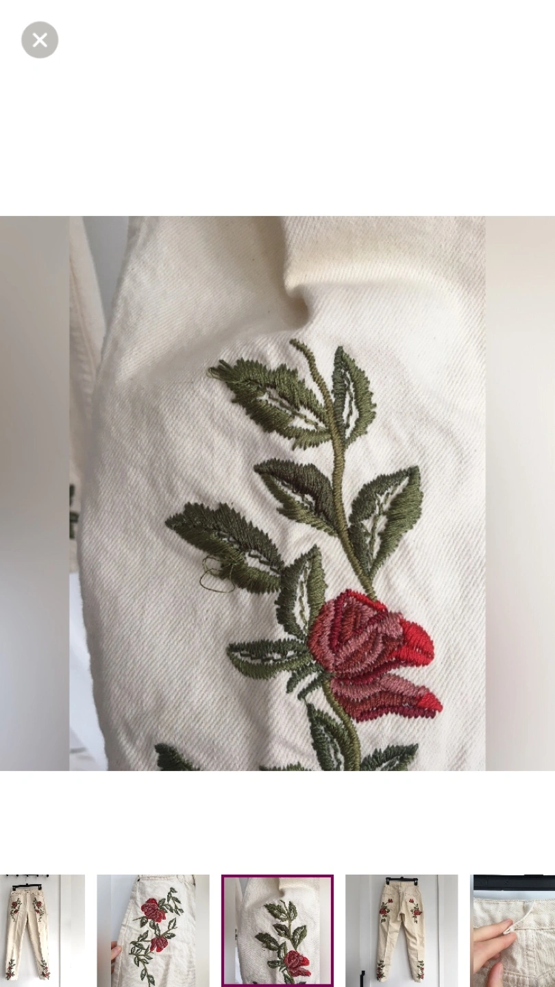 Cream coloured mom jeans. Features embroidered roses. Size W25 L32. Made in Turkey. Some small imperfections (one belt loop, pulled threads) shown in pics