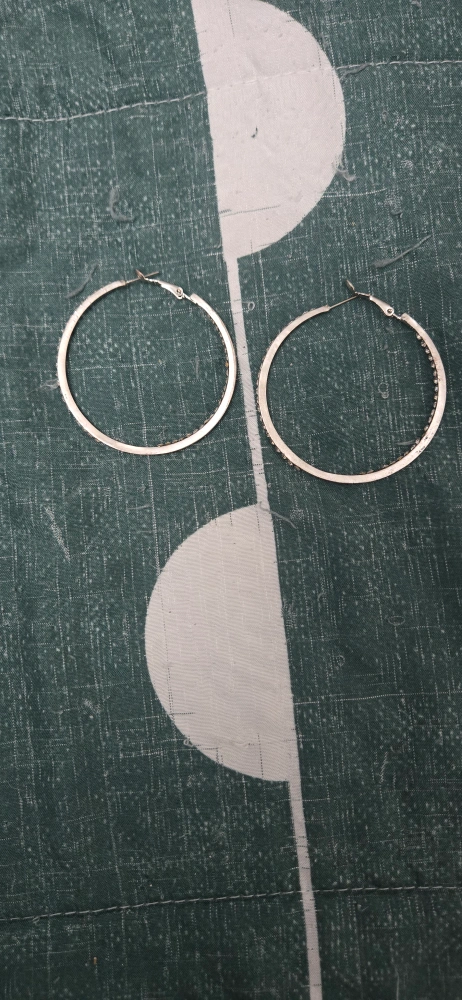 Pair of silver hoop earrings. Large hoops. Rhinestone accents.