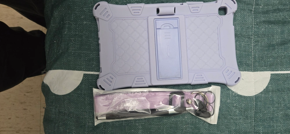 Protective case for tablet. Features a stand, textured surface, and rugged design. Includes a detachable shoulder strap and stylus.