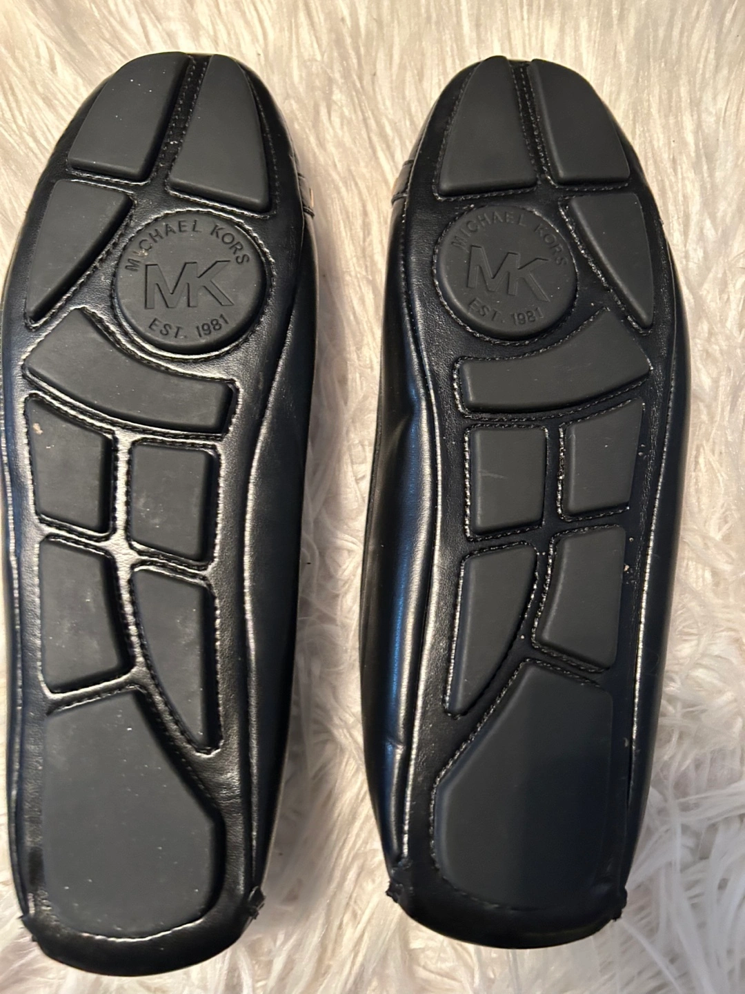 Women's black leather loafers. Gold MK logo. Studded detailing. Good condition. Size 10.