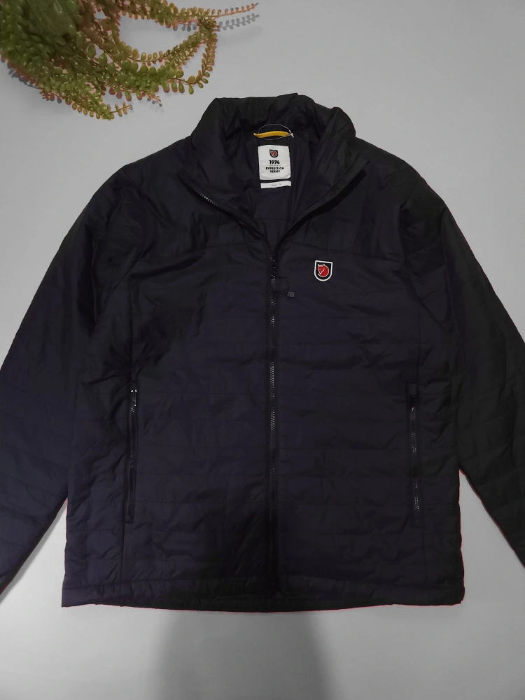 Men's black insulated jacket. Zipper closure. Features two pockets. Lightweight and warm. Size L