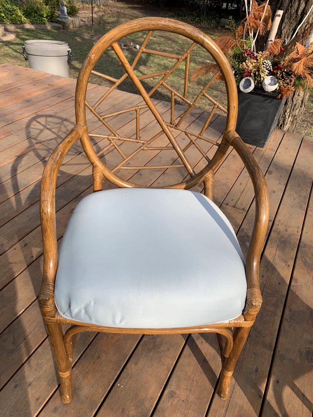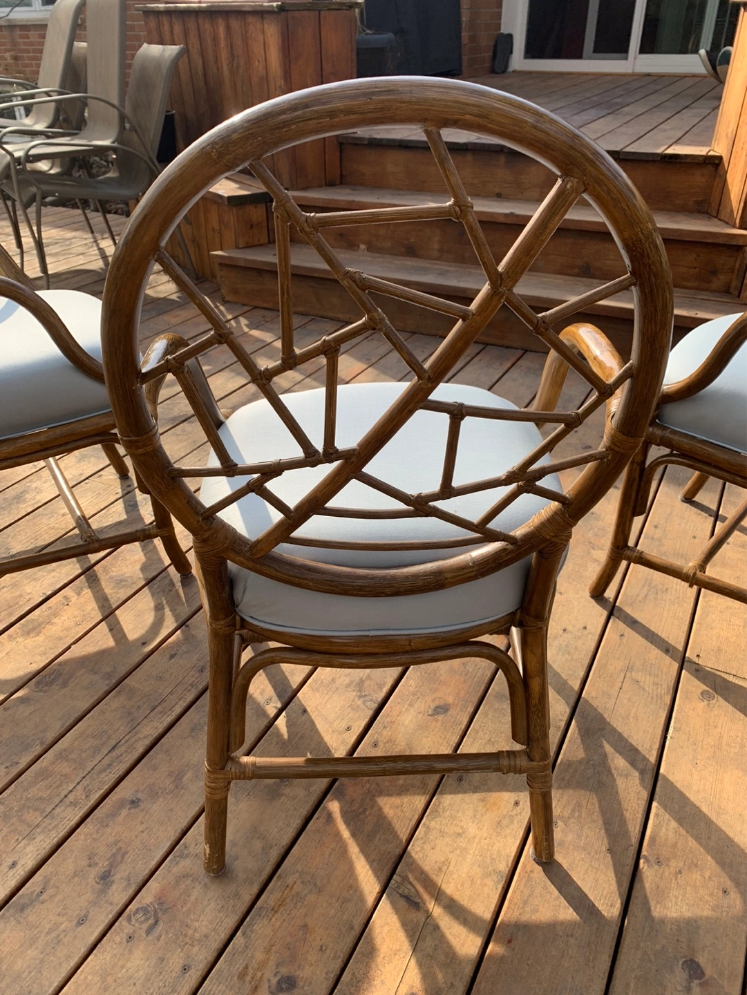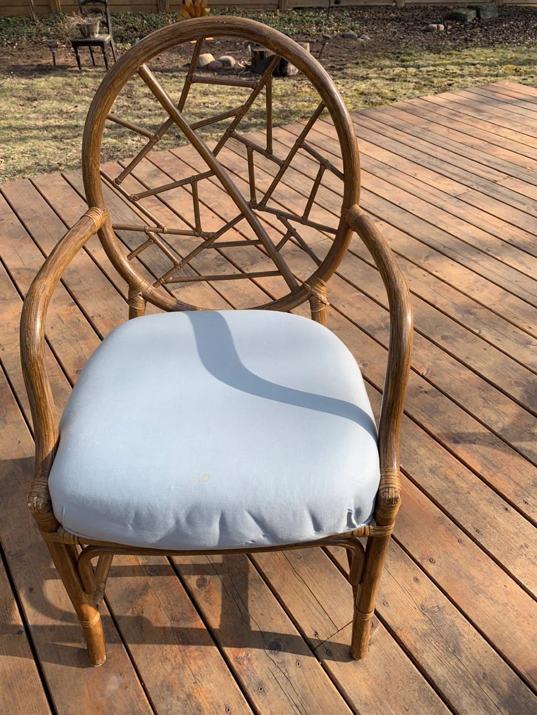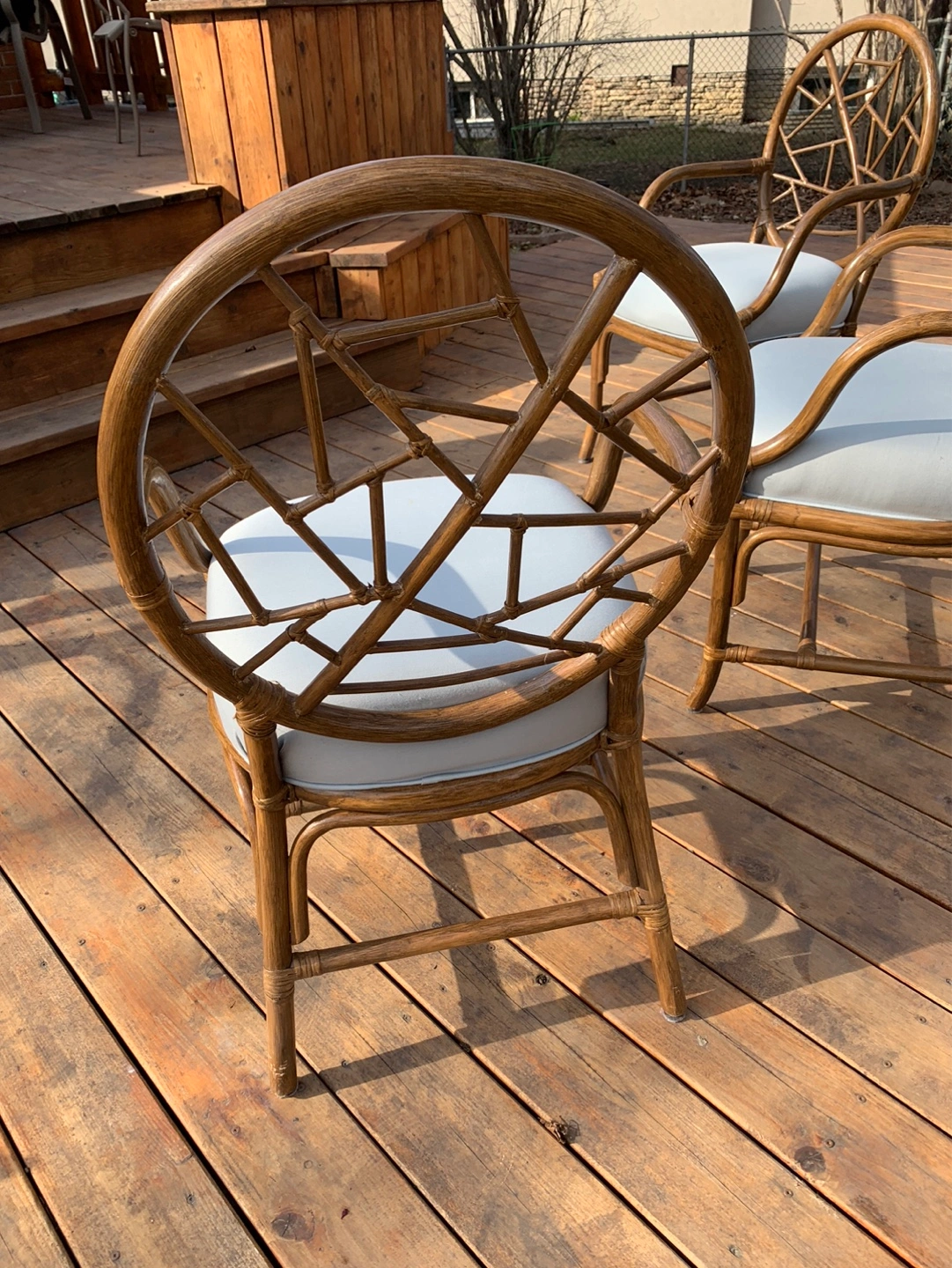Set of four vintage rattan armchairs. (One chair still in storage but is available). They have light blue cushions. Unique design on the back of the chairs. Great for a patio or sunroom. Can also be used around a dining/kitchen table. Some cushions have a small stain but can be cleaned or reupholstered. Selling as a set. Cash only please.