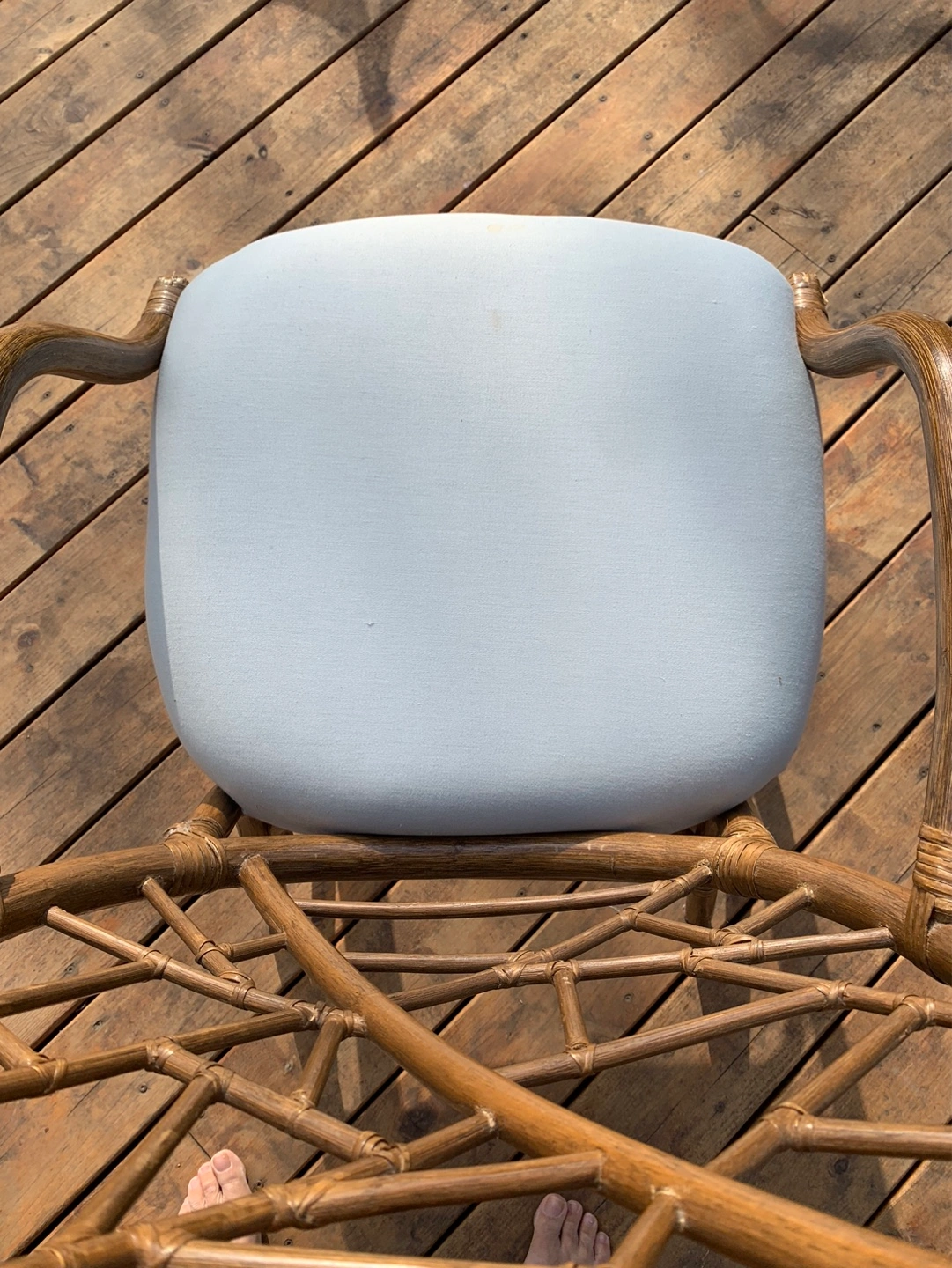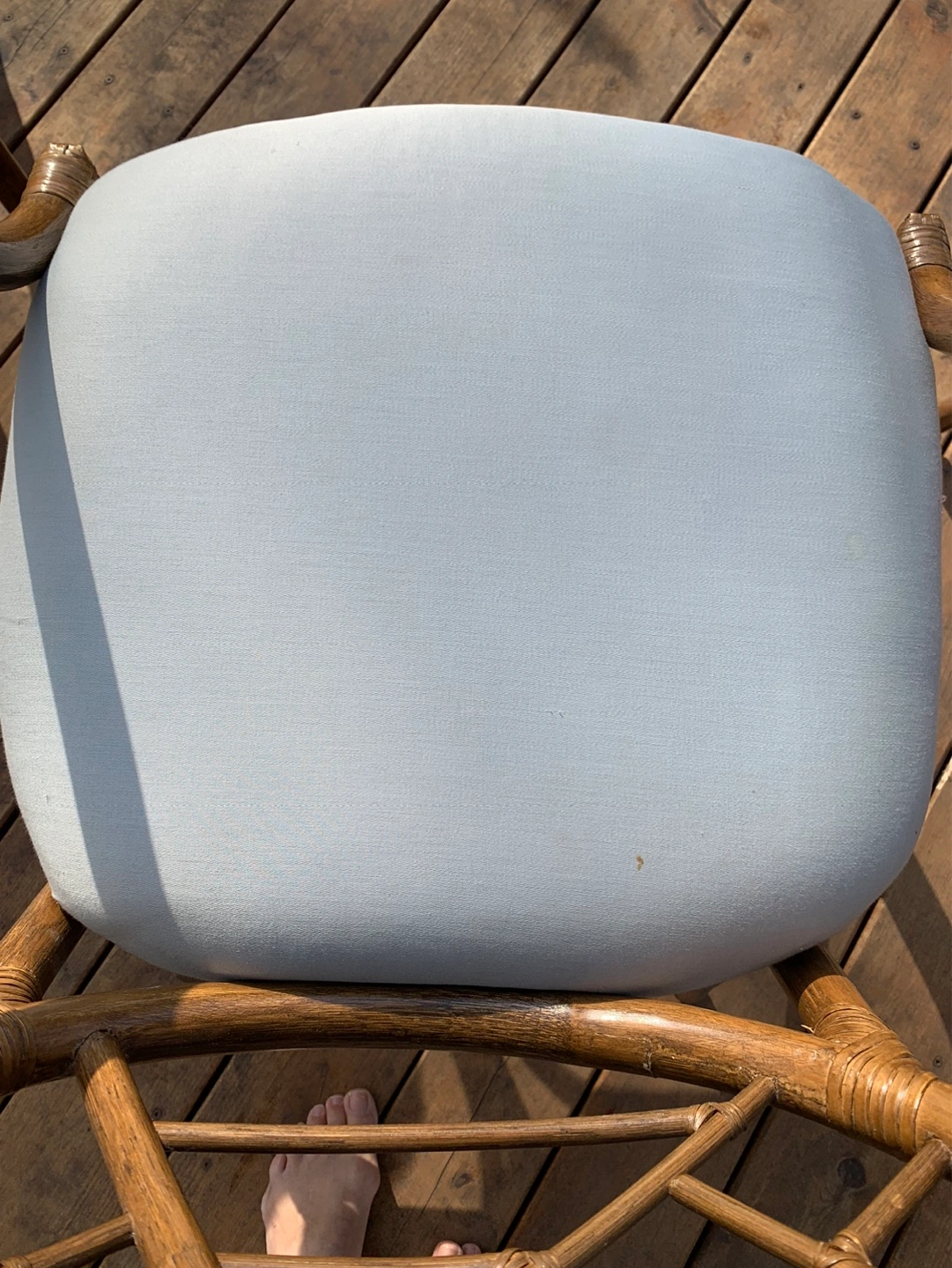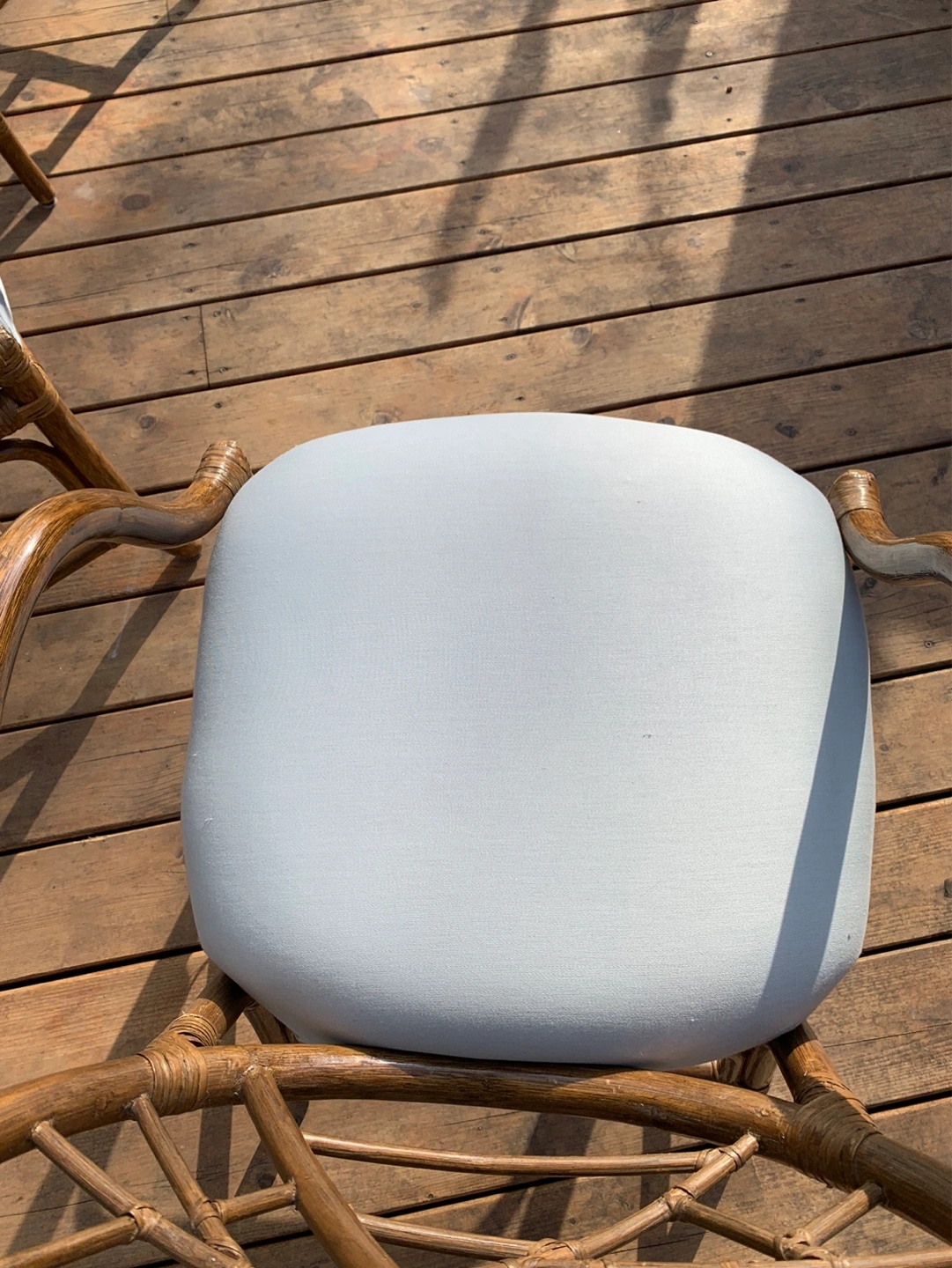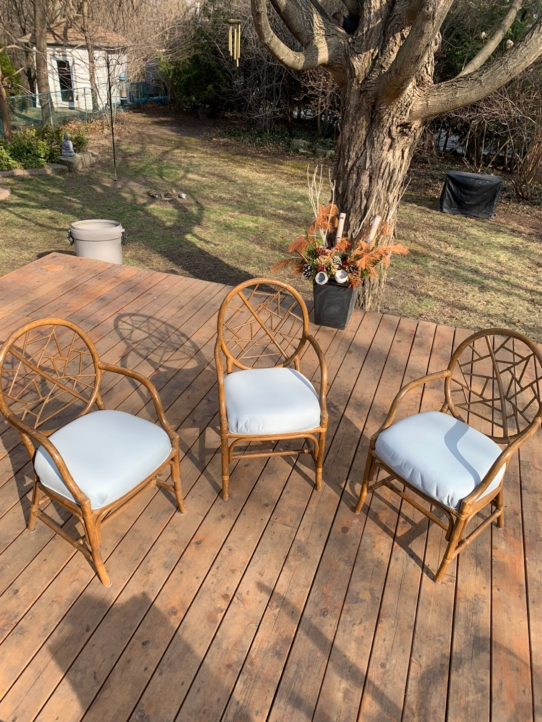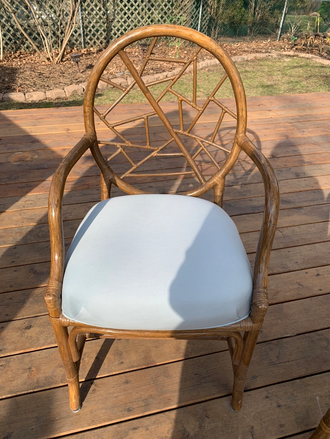 Set of four vintage rattan armchairs. (One chair still in storage but is available). They have light blue cushions. Unique design on the back of the chairs. Great for a patio or sunroom. Can also be used around a dining/kitchen table. Some cushions have a small stain but can be cleaned or reupholstered. Selling as a set. Cash only please.