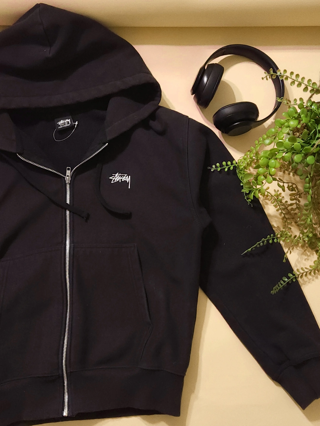 Men's black zip-up hoodie. Features a drawstring hood and kangaroo pocket. Small Stüssy logo embroidered on the chest. Size S