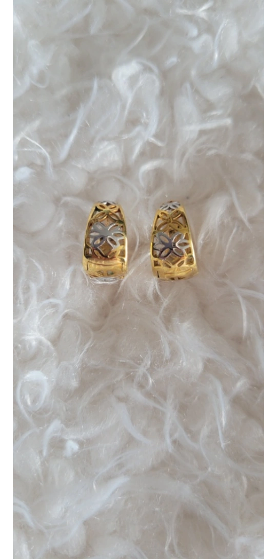 Pair of 18k gold-filled (not stamped), 2 tone hoop earrings. Intricate cut-out design. Approximately 1 inch in diameter. Lightweight. It never tarnished. I had it sitting on my jewelry cabinet for over 10 years, and the color never changed. It's like owning an actual gold piece of jewelry for a fraction of the price. Check out my other listings and bundle to save. ๐๐ป๐ธ Cash and pickup only on Brimley and Eglinton Rd E. in Scarborough.
