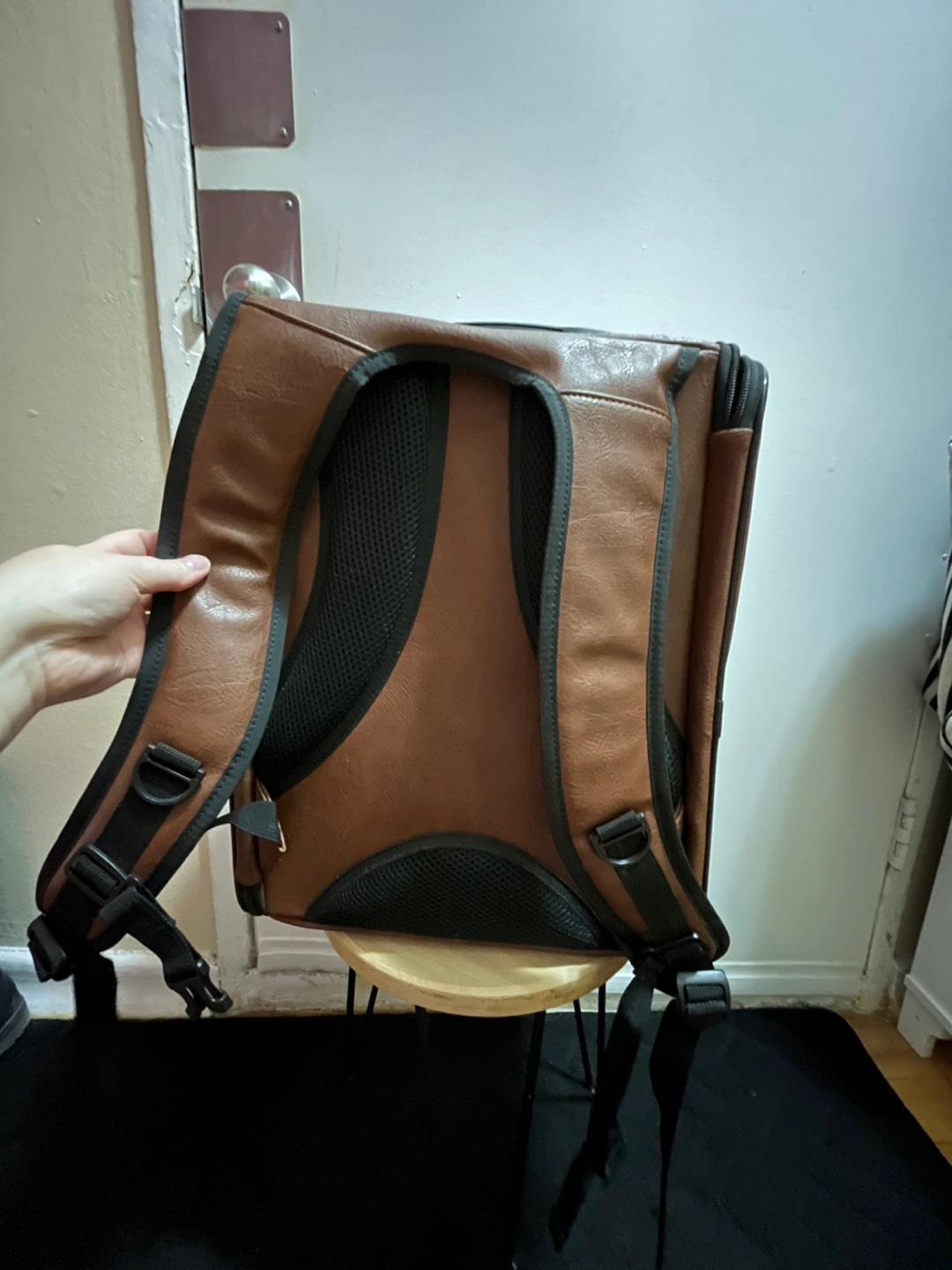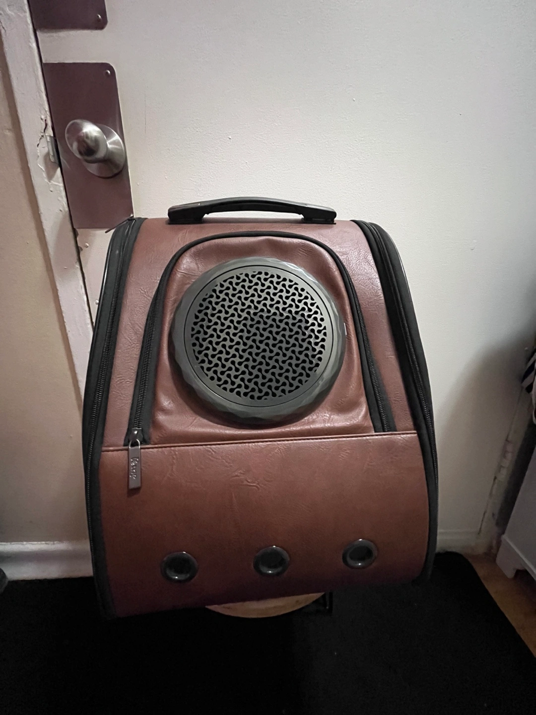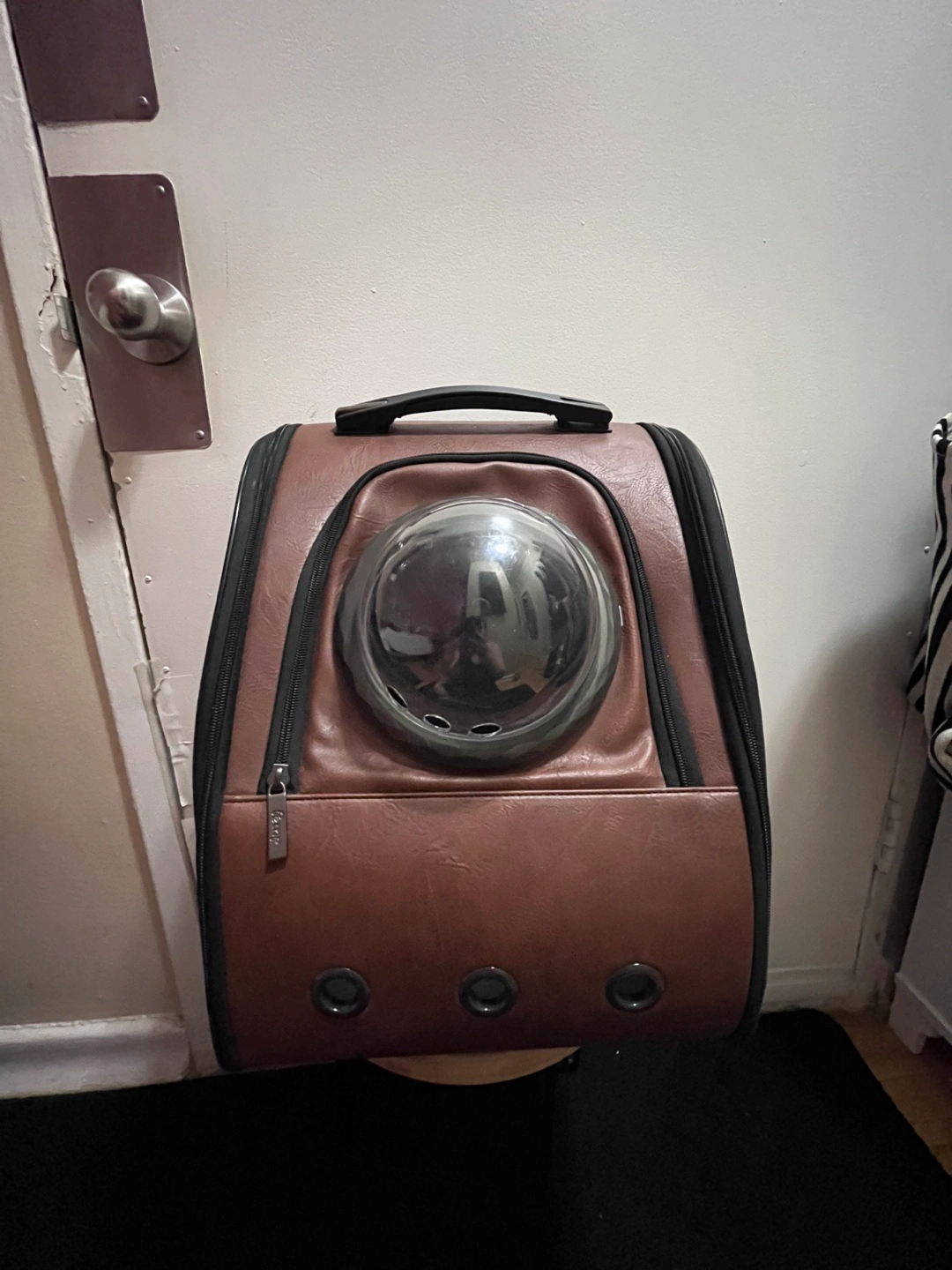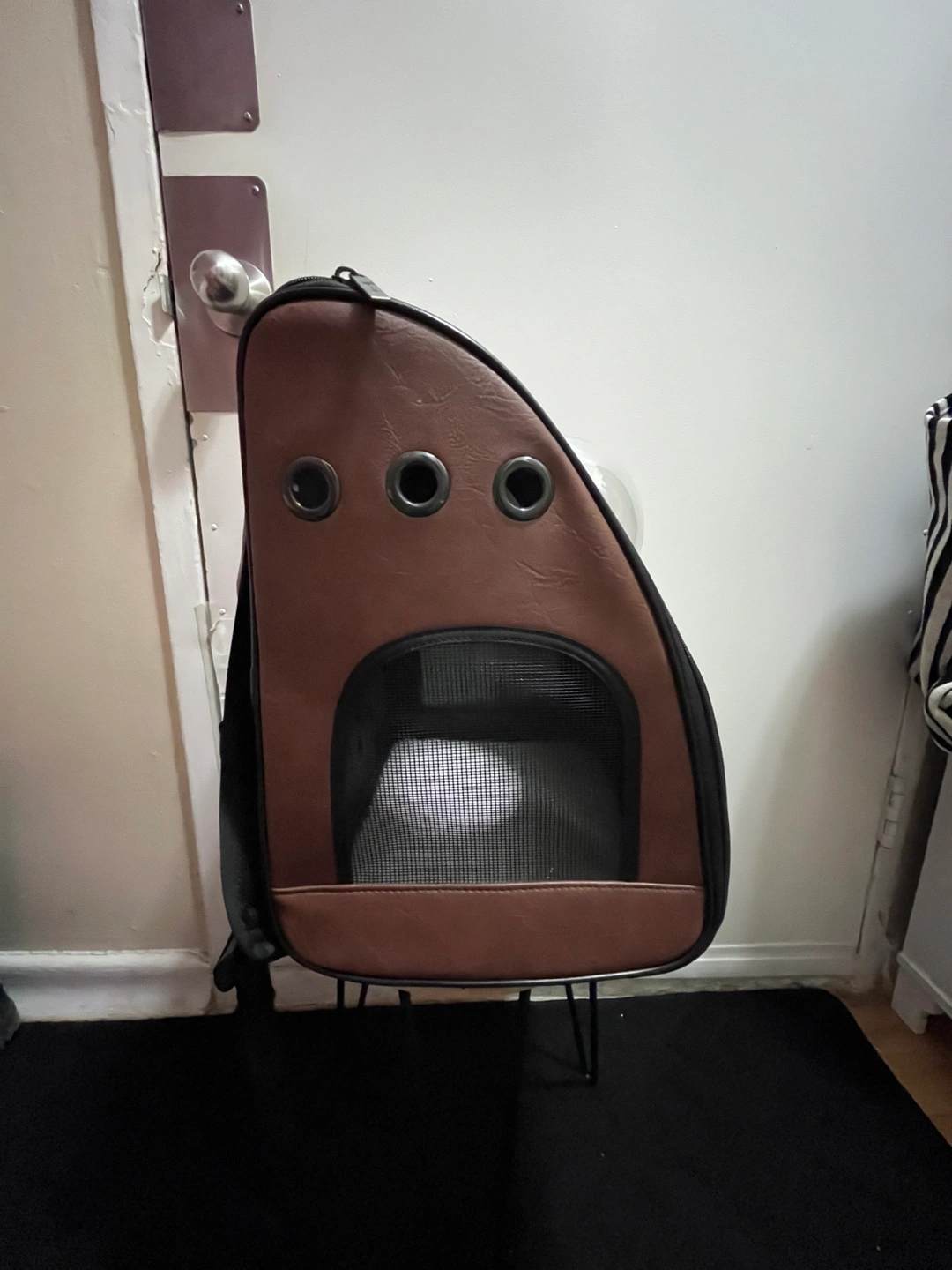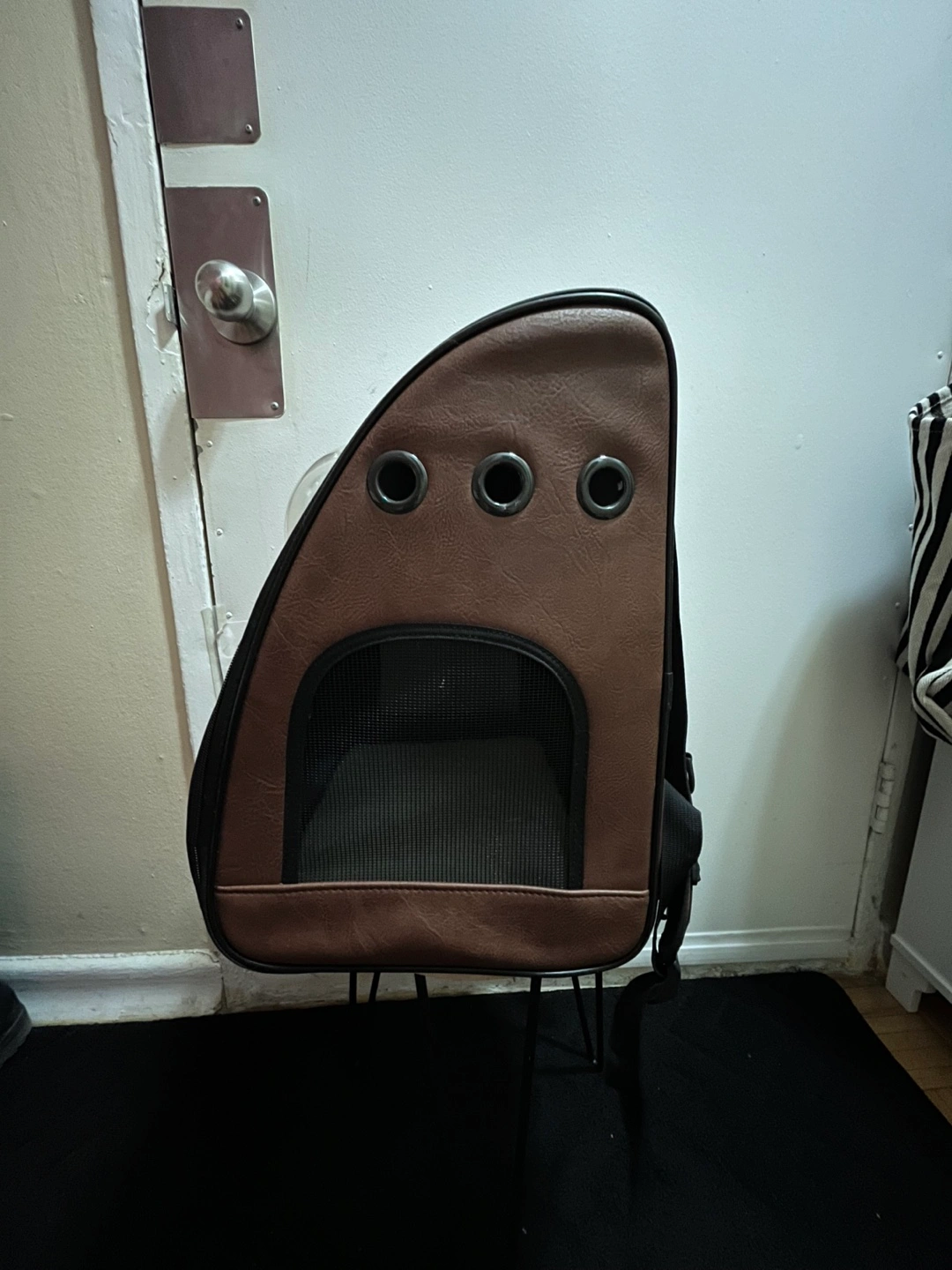 Sturdy large size faux-leather pet carrier backpack. Features bubble window with ventilation holes and an additional screen. Has adjustable padded straps with a chest buckle and back padding. Both sides have ventilation and unzip for easy access. An inside clip lanyard is included to clip to collars for additional safety. Bottom faux shearling mat is removable and washable. Suitable for cats or small dogs. Used a handful of times for a 10lb cat. In very good condition. Has been cleaned and disinfected. Measurements: 13 in wide, 12 in deep, 16 in tall. LOCATION: For PICKUP ONLY in Parkdale near King St W and Jameson avenue. Will give exact address for confirmed pickups only.