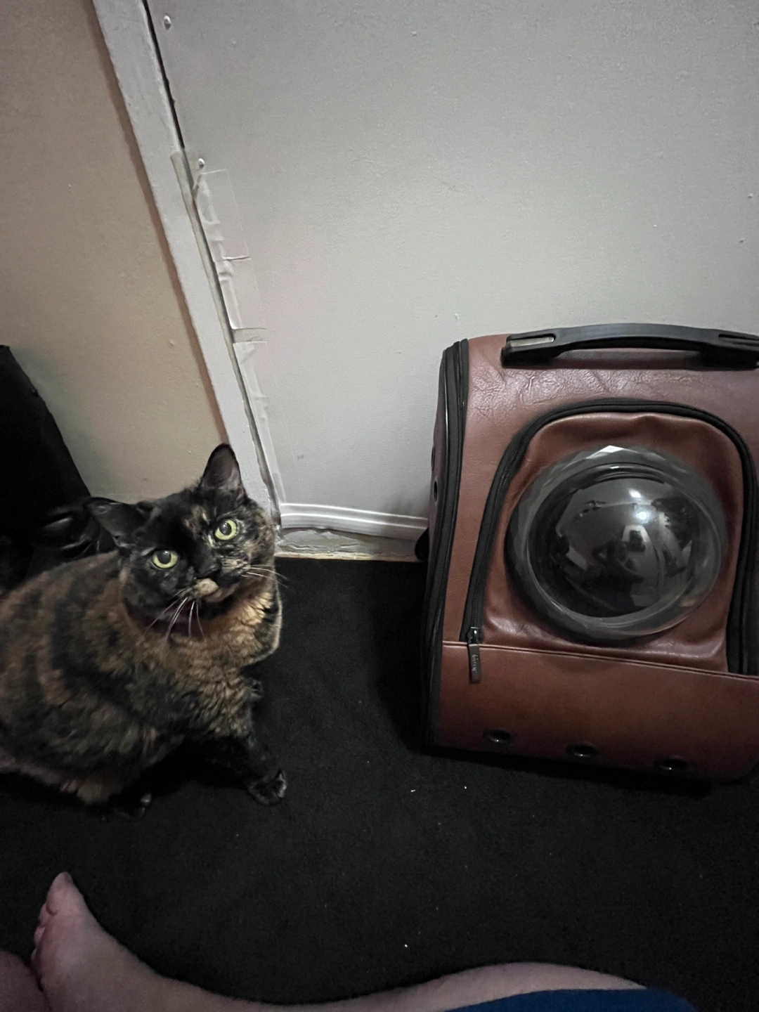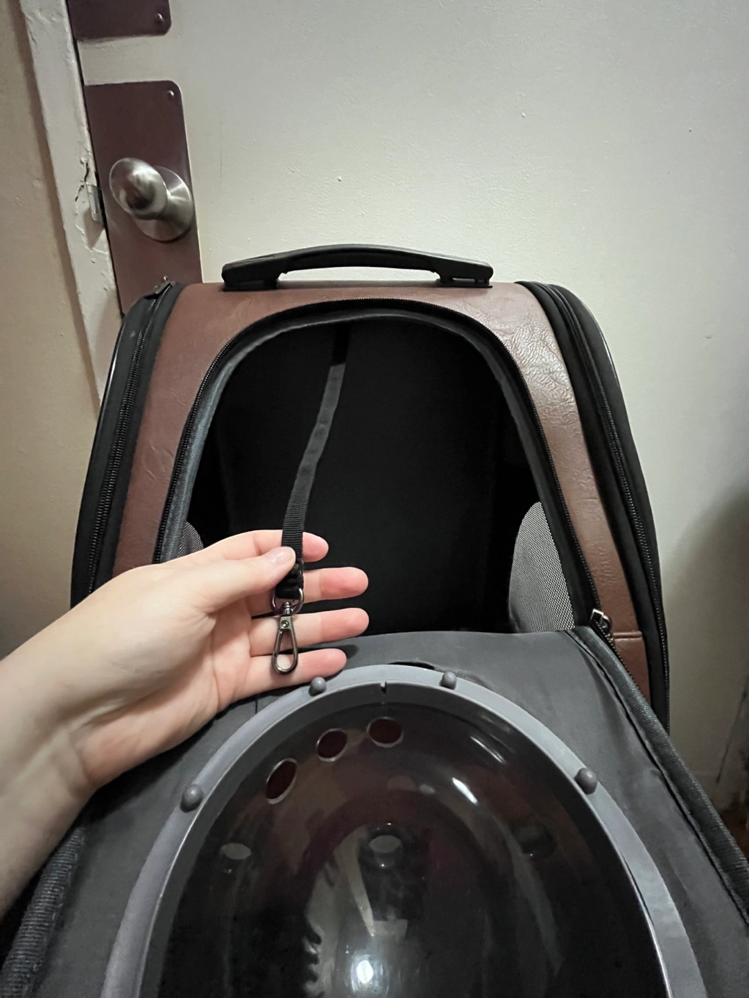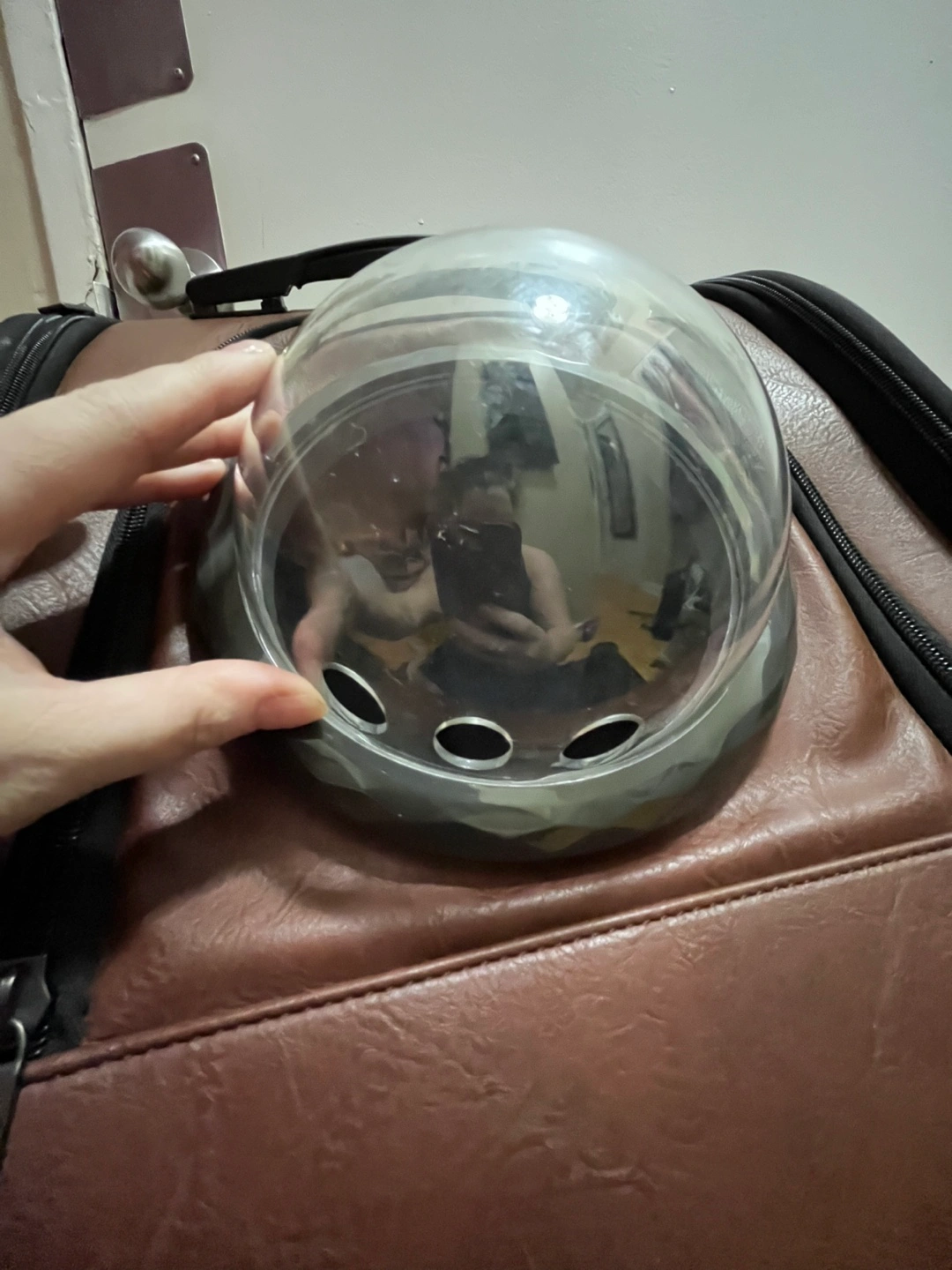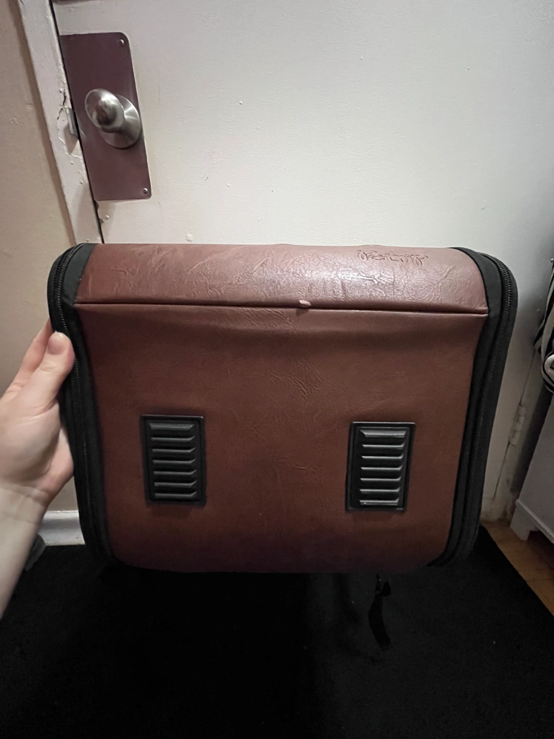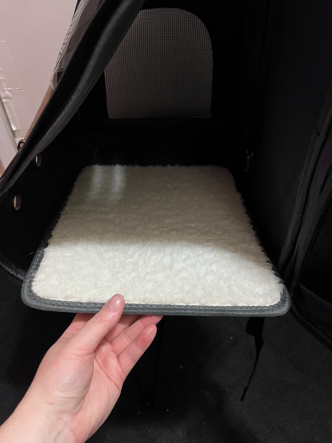Sturdy large size faux-leather pet carrier backpack. Features bubble window with ventilation holes and an additional screen. Has adjustable padded straps with a chest buckle and back padding. Both sides have ventilation and unzip for easy access. An inside clip lanyard is included to clip to collars for additional safety. Bottom faux shearling mat is removable and washable. Suitable for cats or small dogs. Used a handful of times for a 10lb cat. In very good condition. Has been cleaned and disinfected. Measurements: 13 in wide, 12 in deep, 16 in tall. LOCATION: For PICKUP ONLY in Parkdale near King St W and Jameson avenue. Will give exact address for confirmed pickups only.