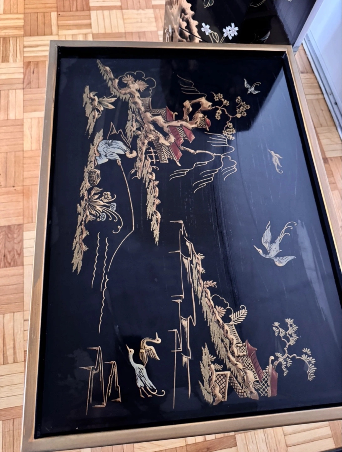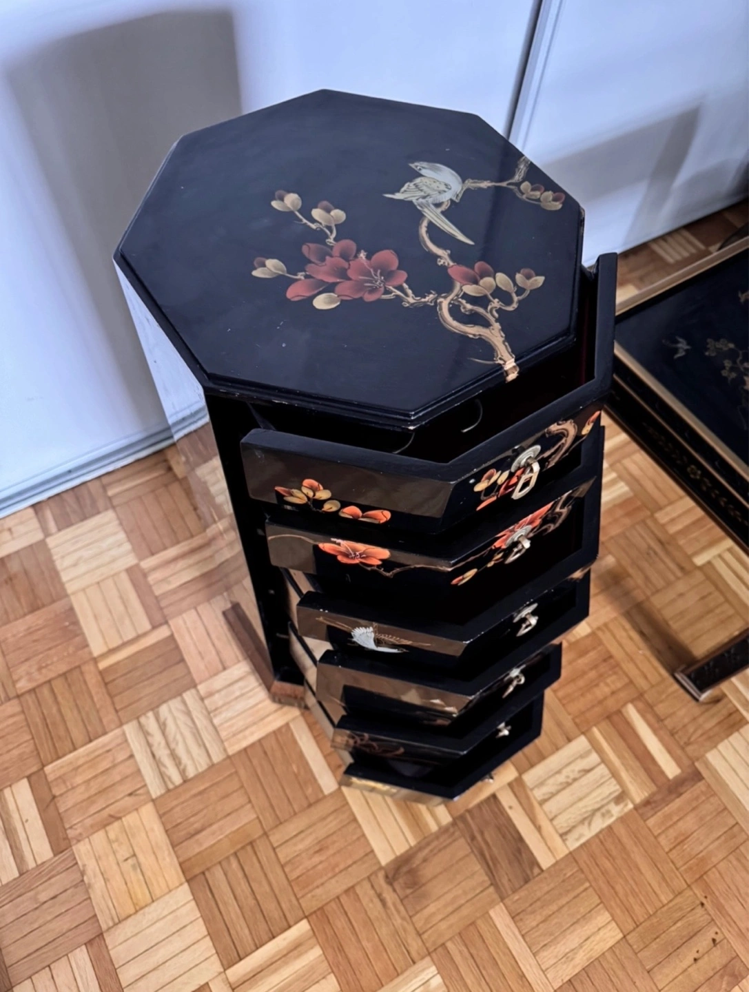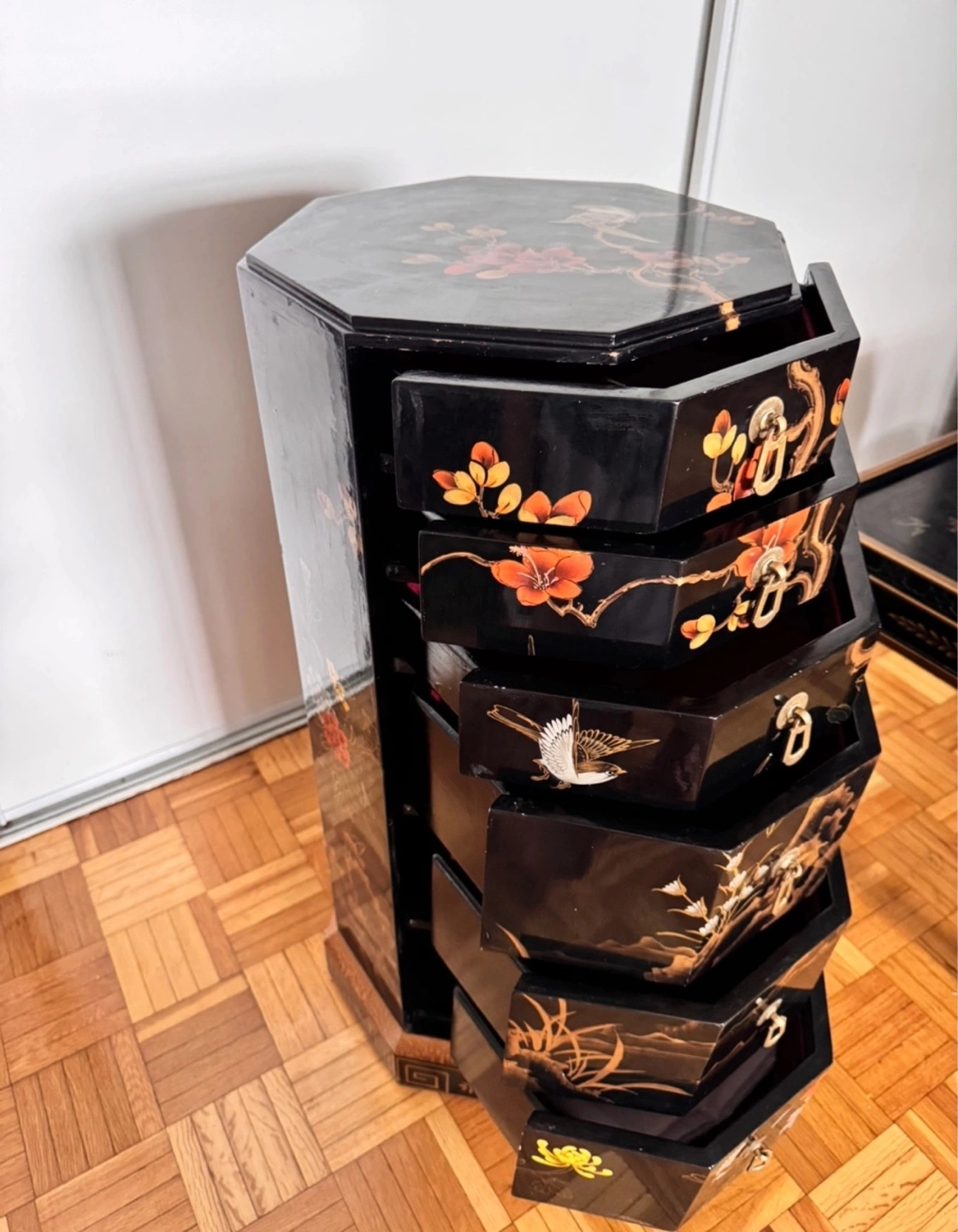 Beautiful set of vintage Asian-style nesting tables. Octagonal side table features multiple small drawers. Coffee table features a glass top with painted landscape. Matching decorative wall art included. Unique and stylish.