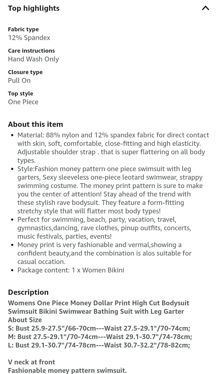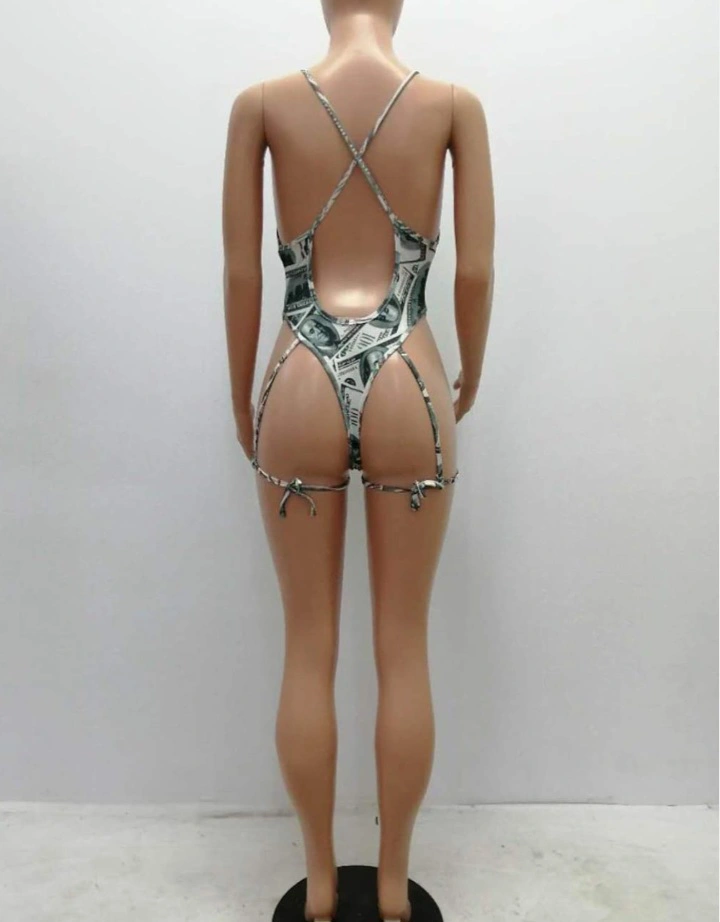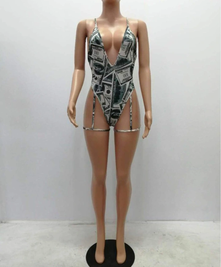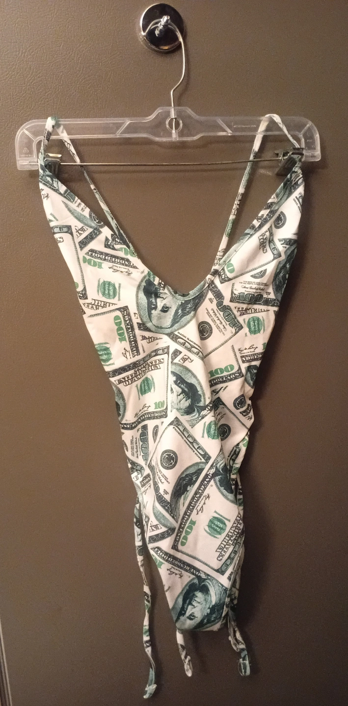 Unique one-piece swimsuit. Features a deep V-neck, high-leg cut, and a thong back. Made from a stretchy material. All-over money print. Leg straps included. - see images for details - click image to enlarge - scroll to left to see more images PLEASE "FOLLOW" ME, AS I OFFER A VARIETY OF DIFFERENT ITEMS AT FANTASTIC PRICES! HOPE TO SEE YOU SOON! THANKS FOR YOUR TIME . Exact Cash Please - If you need change please let me know ahead of time so I can get change. BM33 S00776