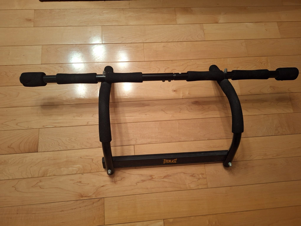 Doorway pull-up bar. Great for home workouts. Easy to install and use. Durable construction. Black finish.