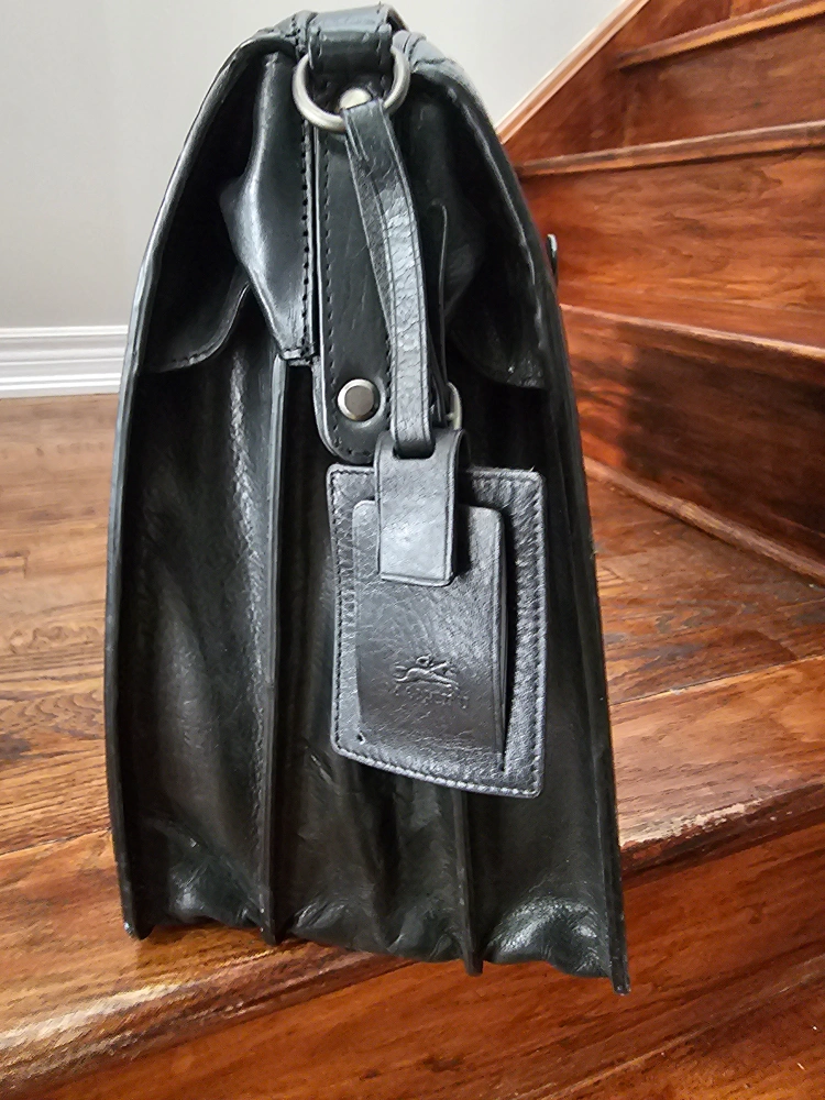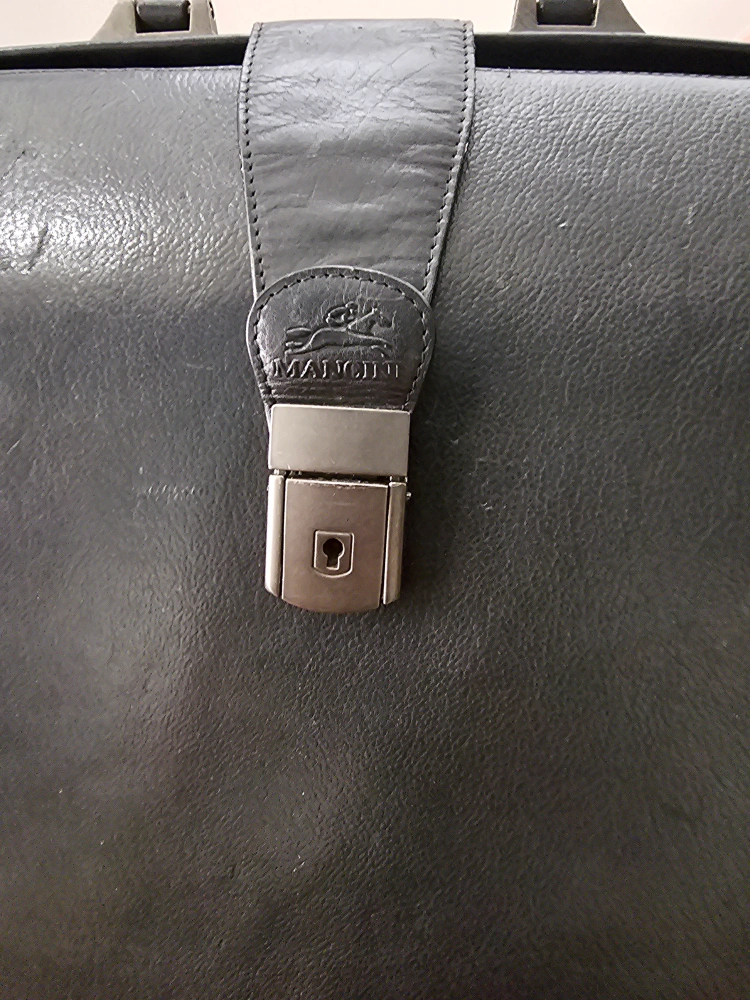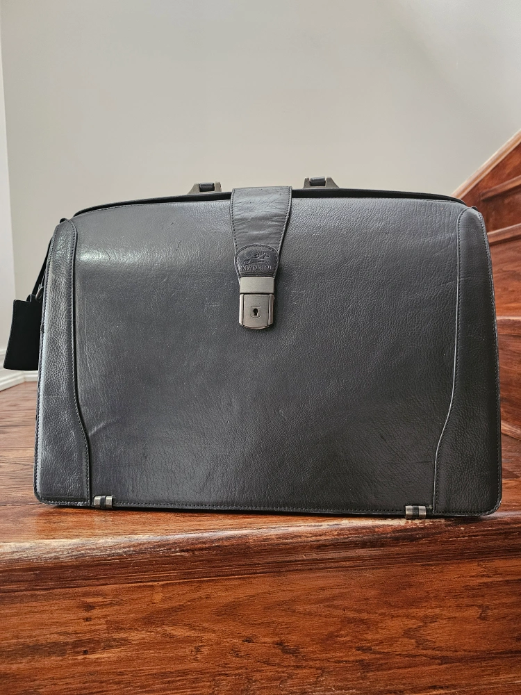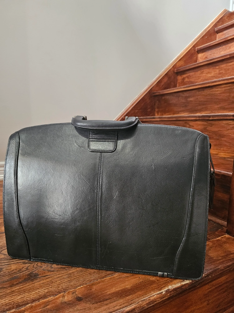 πBlack leather briefcase. Features a lock and carrying handle. Shows some slight wear consistent with age and use but is very classy and functional. Great for professional use or everyday carrying.