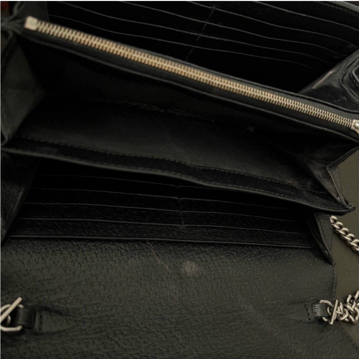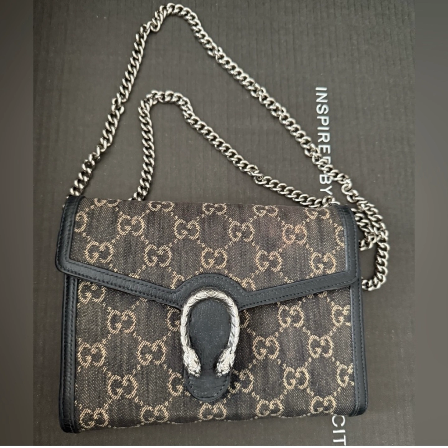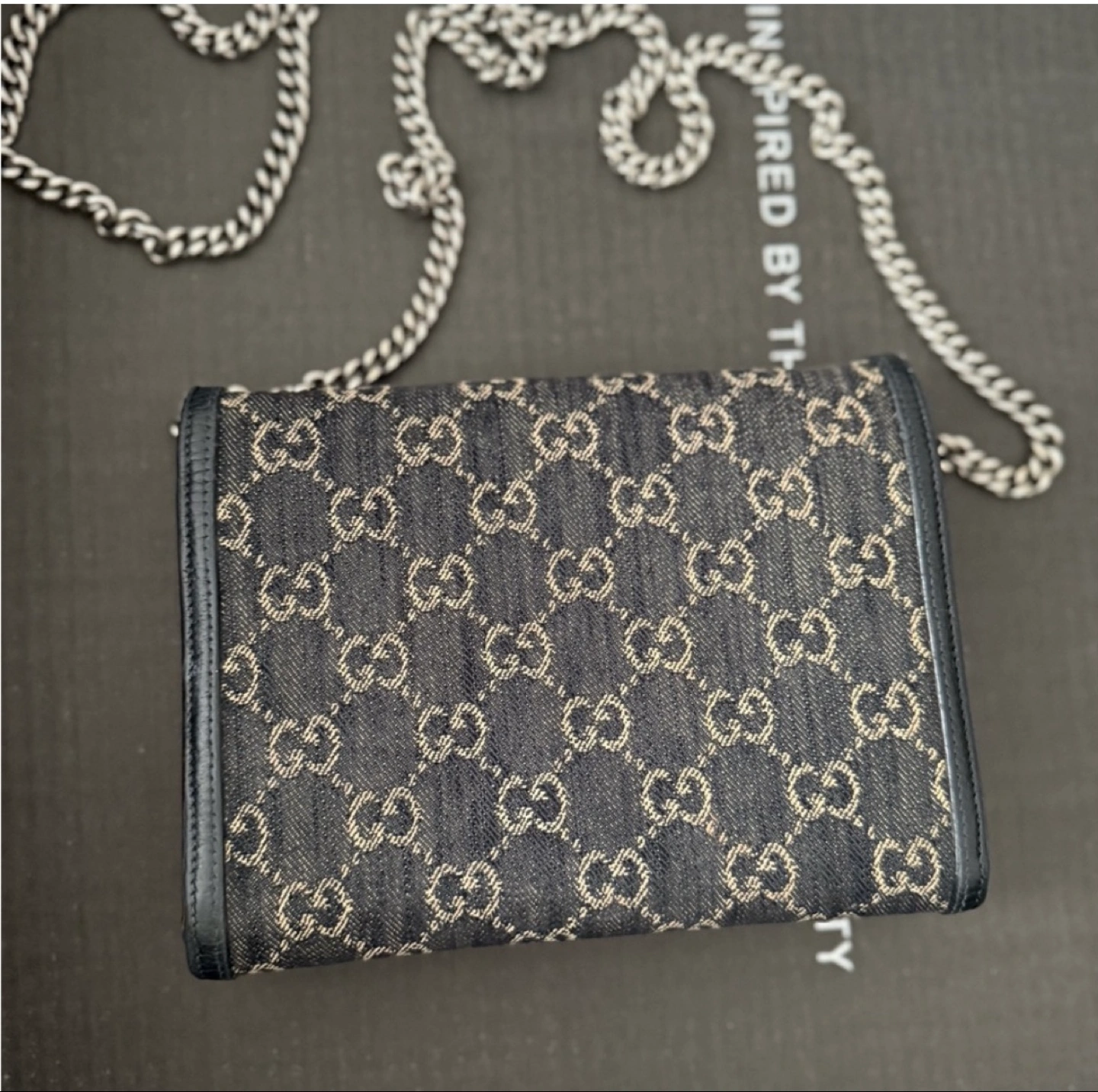 Gorgeous Gucci GG Marmont wallet on chain. Denim material with silver-toned hardware. Features a flap closure and chain strap. Multiple card slots and compartments.